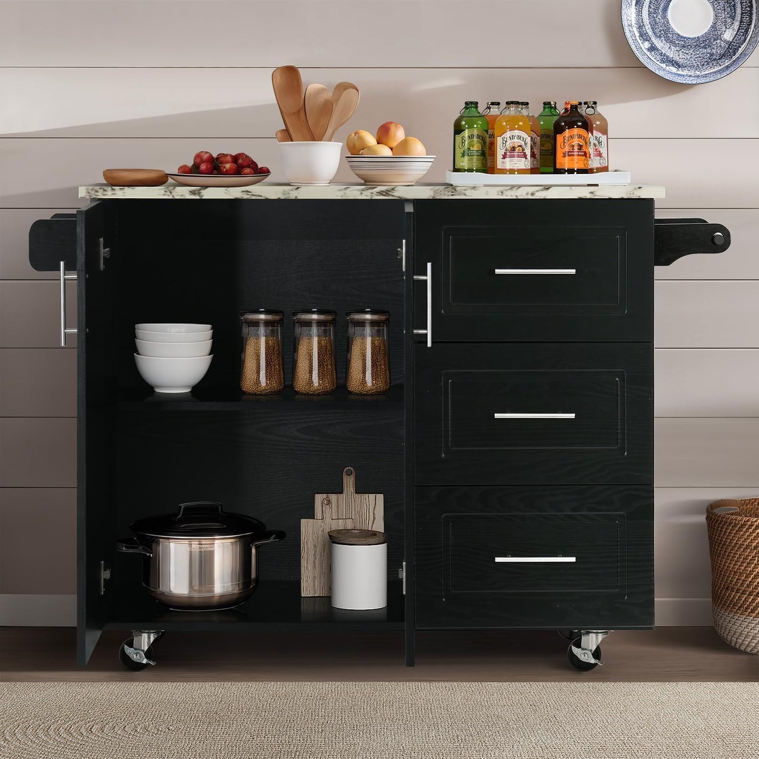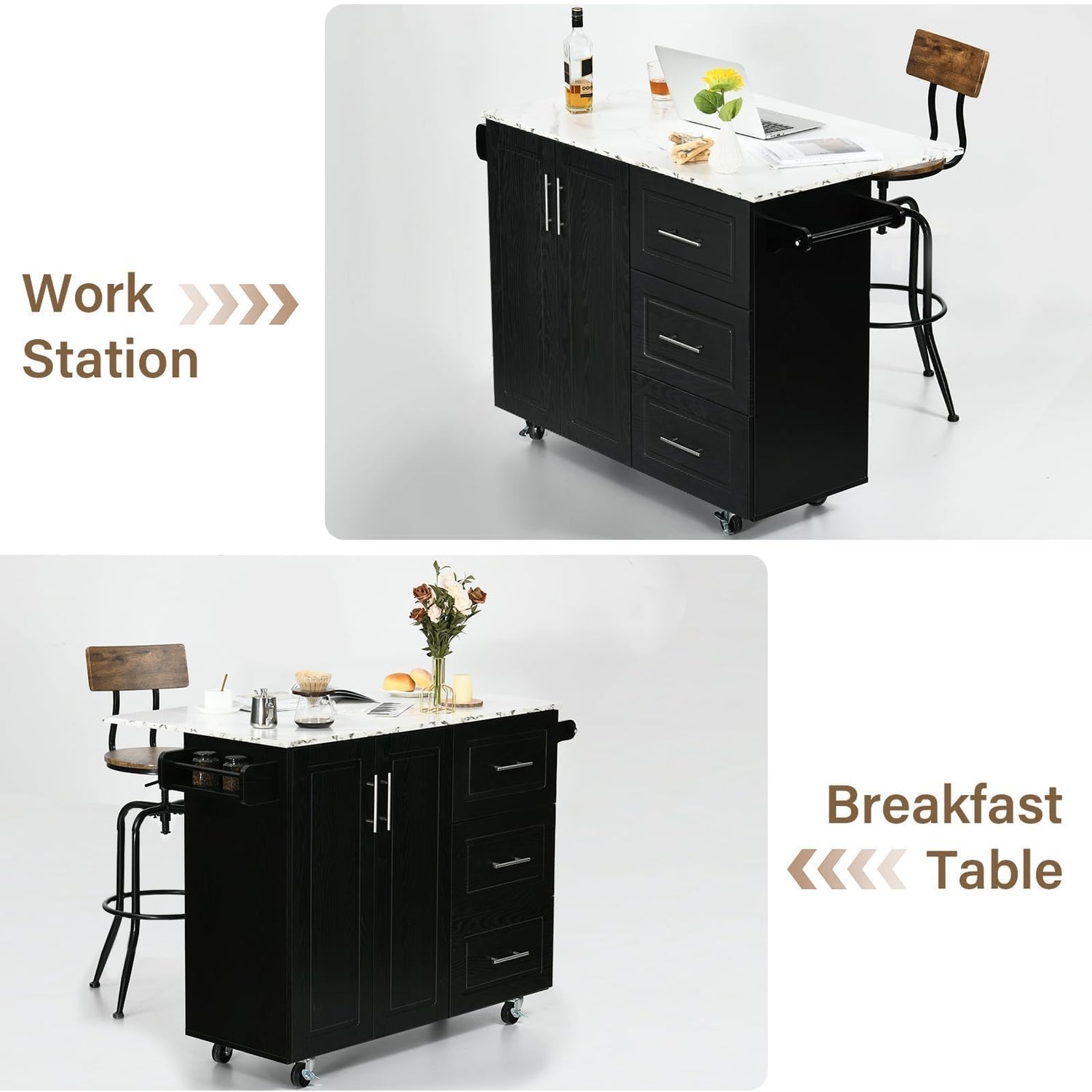 4 EVER WINNER Kitchen Island with Storage, White Marble Tabletop, Rolling Kitchen Island Cart on Wheels with Drop Leaf Breakfast Bar, Island Table for Kitchen with Towel Rack & Spice Rack, Black