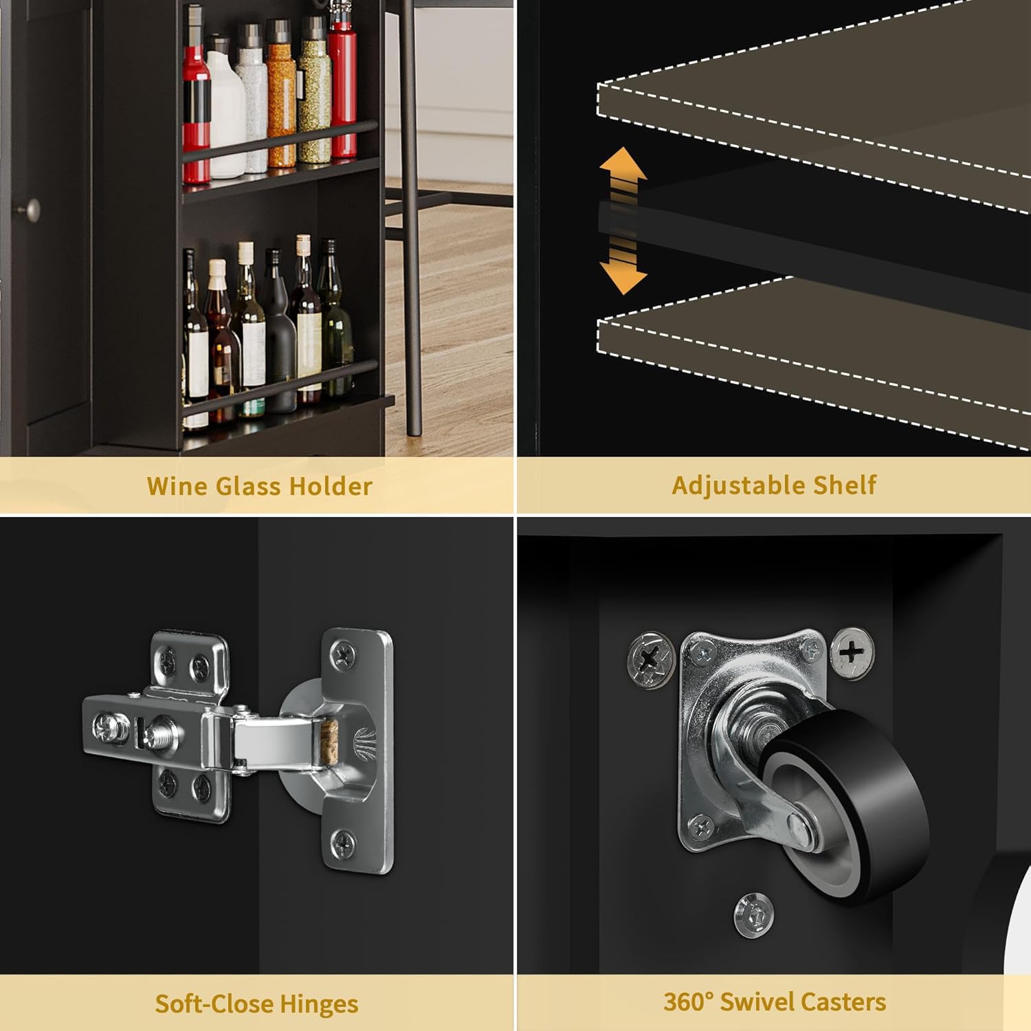 • Safe & Portable - Made of CARB PhraseⅡ certified MDF boards, this island table ensures a safe kitchen & dining room environment; Smooth hidden 360° swivel casters allow the rolling cart with storage to be freely moved wherever you need it, or install without wheels and the cabinet will be an eye-catching modern black stationary centre island in your kitchen;