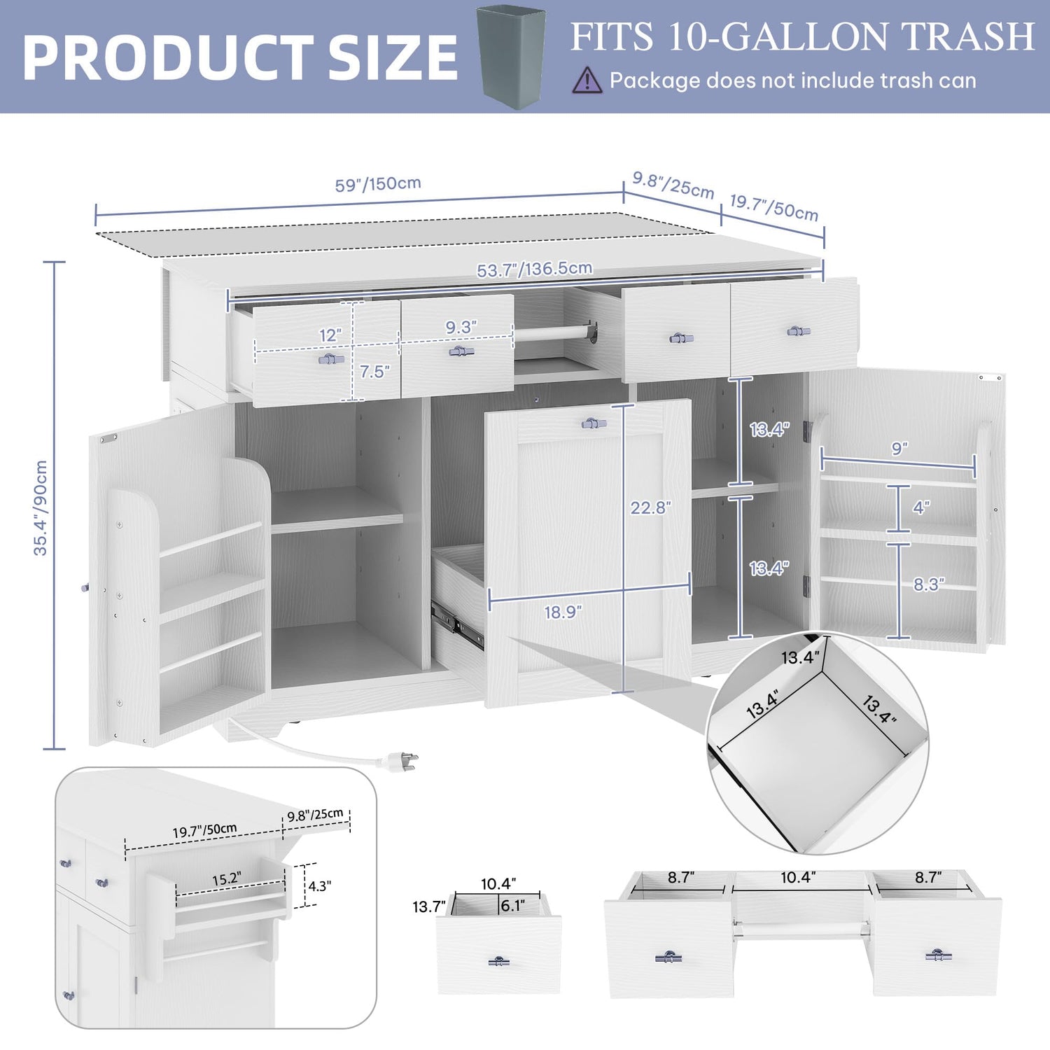 DWVO Kitchen Island with Drop Leaf, 59" Large Mobile Storage Islands with Power Outlet, Double Pull-Out Trash Can Cabinets Fits 10-Gal Garbage Bin, Rolling Kitchen Cart with Spice & Towel Rack, White