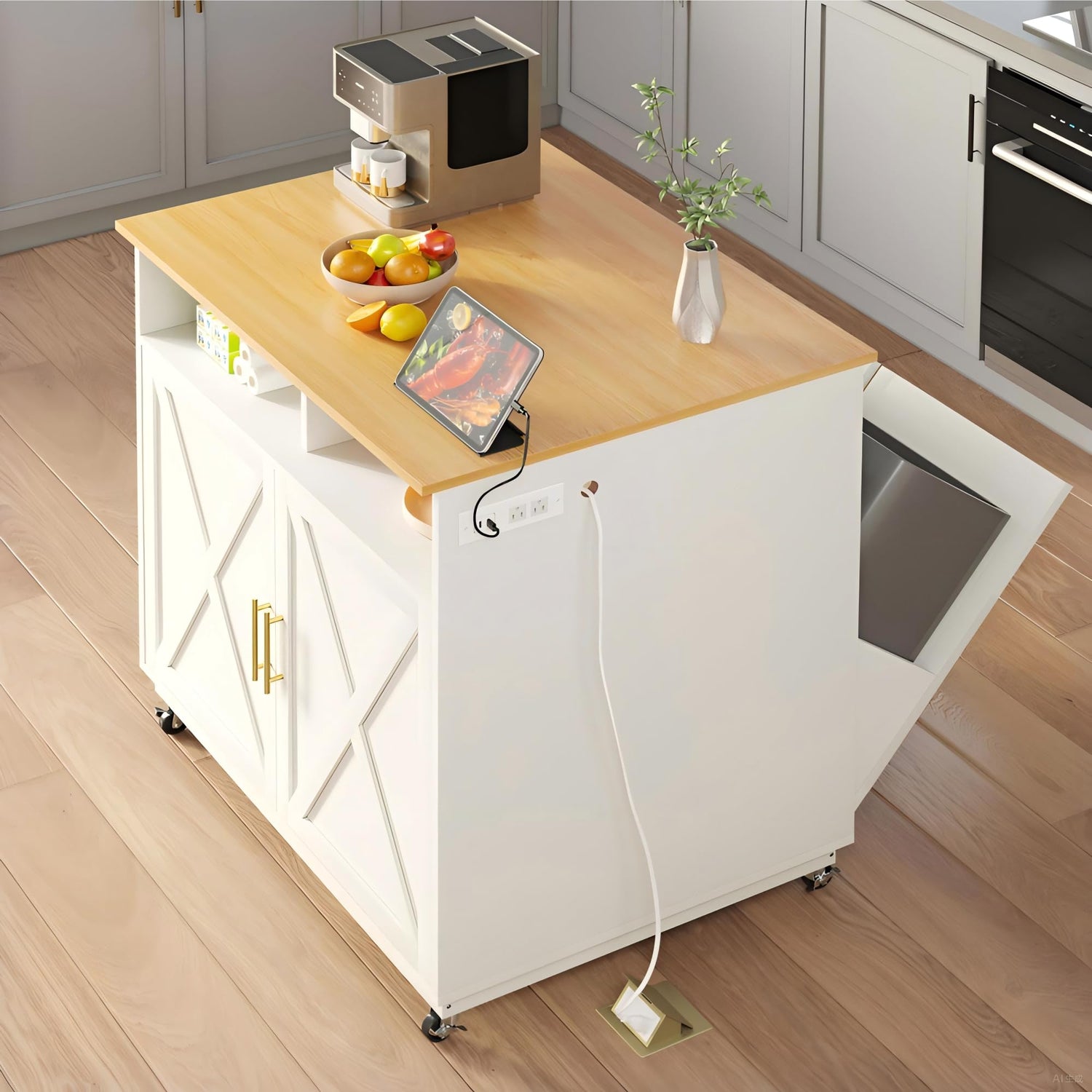 - Tilt Out Trash Can Cabinet: The double tilt out garbage bin storage cabinet is a great addition to your kitchen island. It can house double 10 gallon trash can (not included), preventing the spread of odors and keeping your kitchen & dining room fresher and cleaner