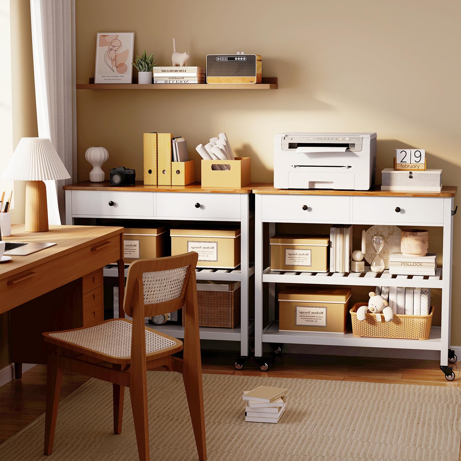 Gizoon Kitchen Island Cart on Wheels with 40'' Wood Tabletop, 2 Open Tiers Spacious Storage Shelves and Towel Rack, Rolling Utility Cart with 3 Side Hooks and 2 Drawer for Dining Room, Bar, White