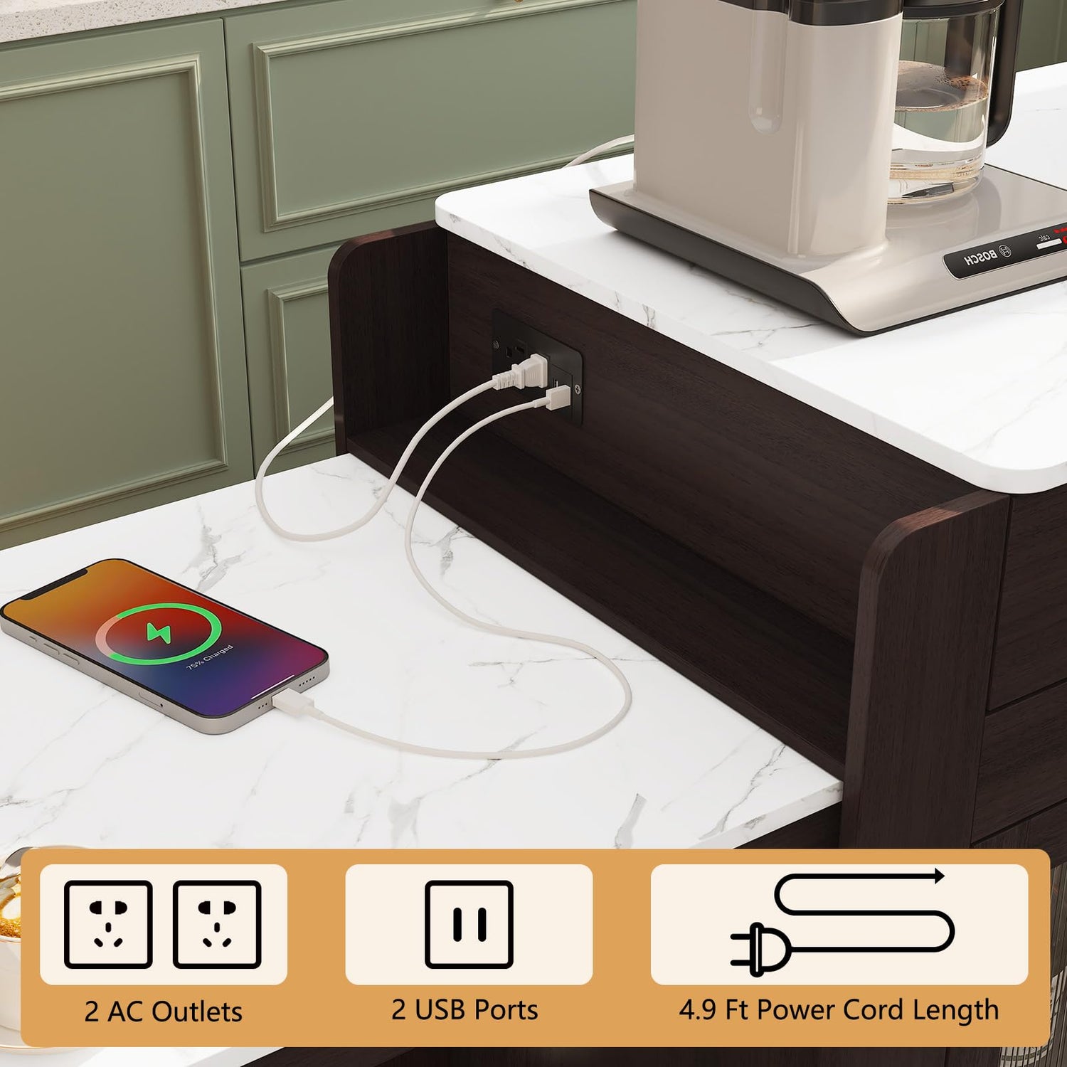 - 【Dinning Table with Charging Station】This kitchen island with power outlet boasts 2 power outlets and 2 USB ports with 4.9 ft power cord length, specifically designed for accommodating microwave ovens, coffee makers, air fryers, and other small kitchen appliances.