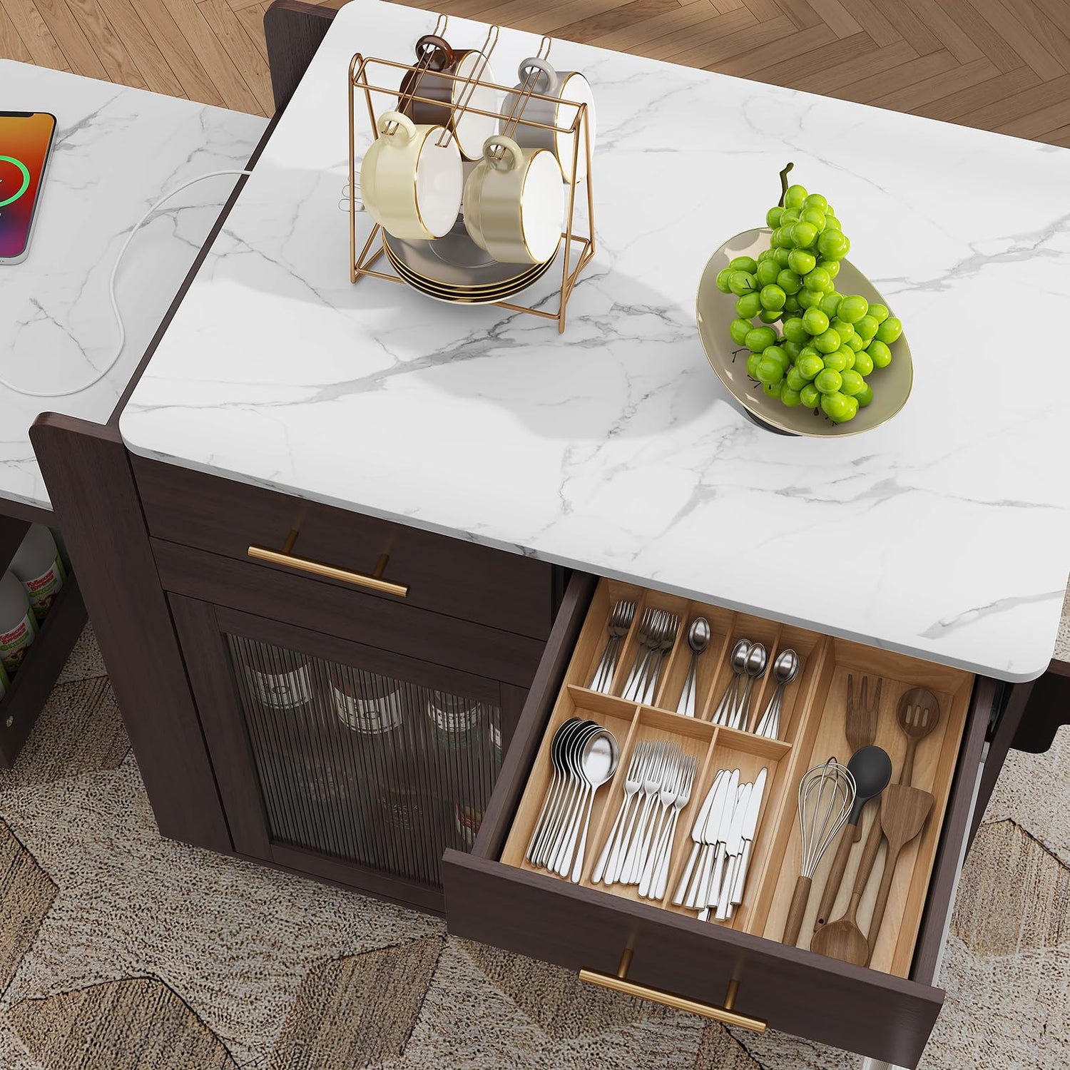 HLR Kitchen Island with Extendable Dining Table, Marble Grain Countertop Island with Power Outlet, Rolling Storage Cart on Wheels with Storage Cabinet and 2 Drawers, Prep Table for Kitchen