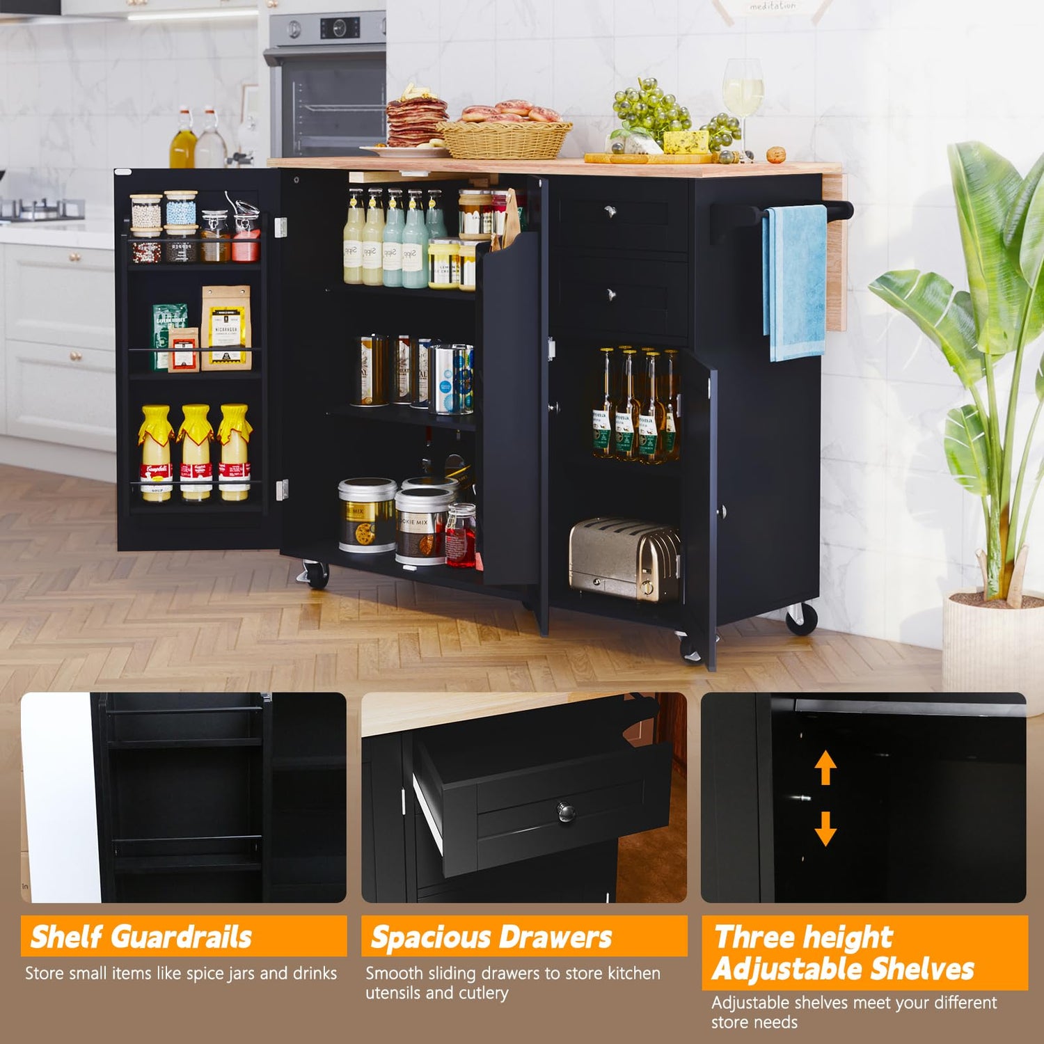 HLR Kitchen Island with Storage, Rolling Kitchen Island on Wheels with Drop-Leaf Bar Countertop, Island Table for Kitchen with Side Open Spice Rack and Tower Rack, Extra Storage for Kitchen