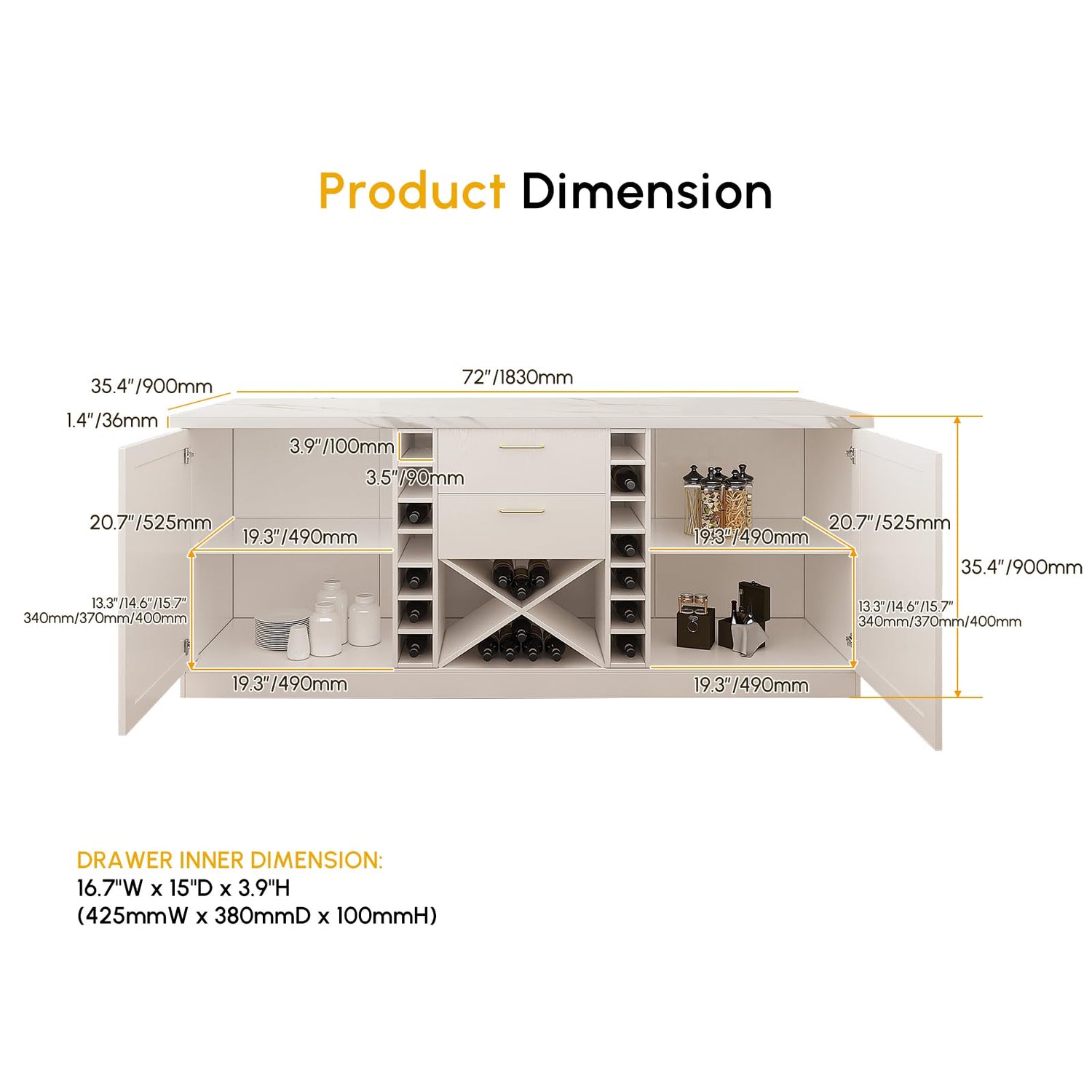 homary 72'' Kitchen Island with Seating Island Table with Wine Storage & 2 Drawers Marble Dining Table for 4 People