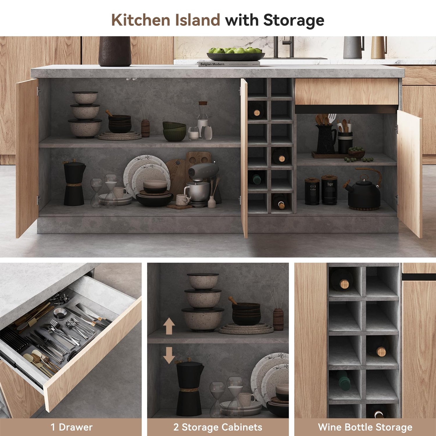 homary 72'' Kitchen Island with Storage Gray Japandi Island Table with LED Light Wood Kitchen Cabinet with Drawers & Wine Rack