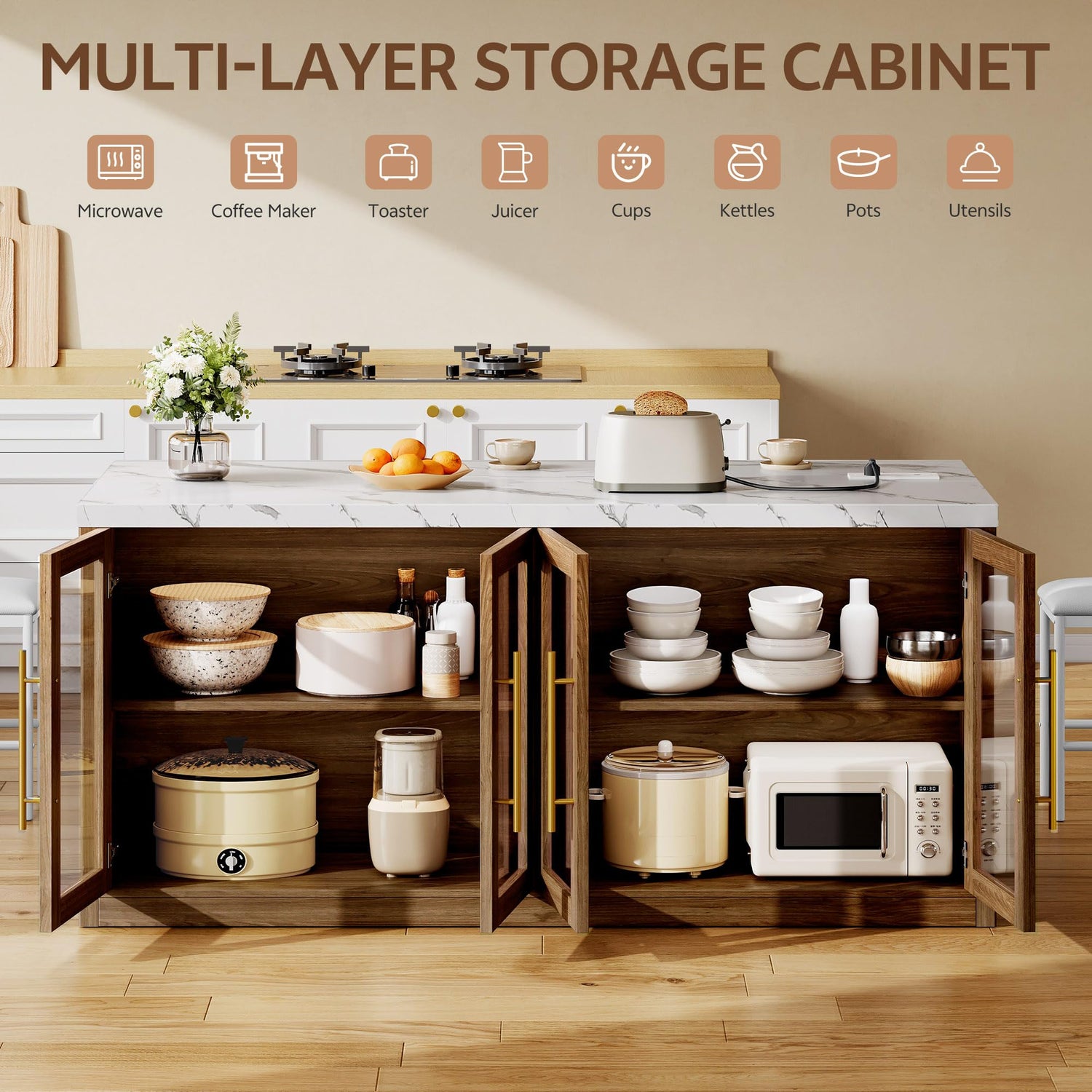 - Adjustable Mega-Storage Capacity: Designed for large storage, the extra-deep cabinet accommodates large appliances like stand mixers and air fryers, while adjustable shelving lets you customize space for pots, pantry items, or cookbooks. The spacious storage cabinet keeps utensils organized, finally solving your kitchen storage challenges.