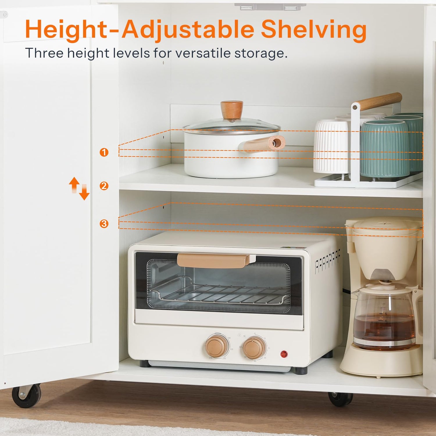 - Kitchen Island with Versatile Storage: Featuring a spacious top, sizable drawer, dual-door cabinet, and open shelves, this kitchen island cart neatly organizes dishes, pots, toasters, cutlery, and spices. The island's 3-height adjustable shelf offers flexible storage space