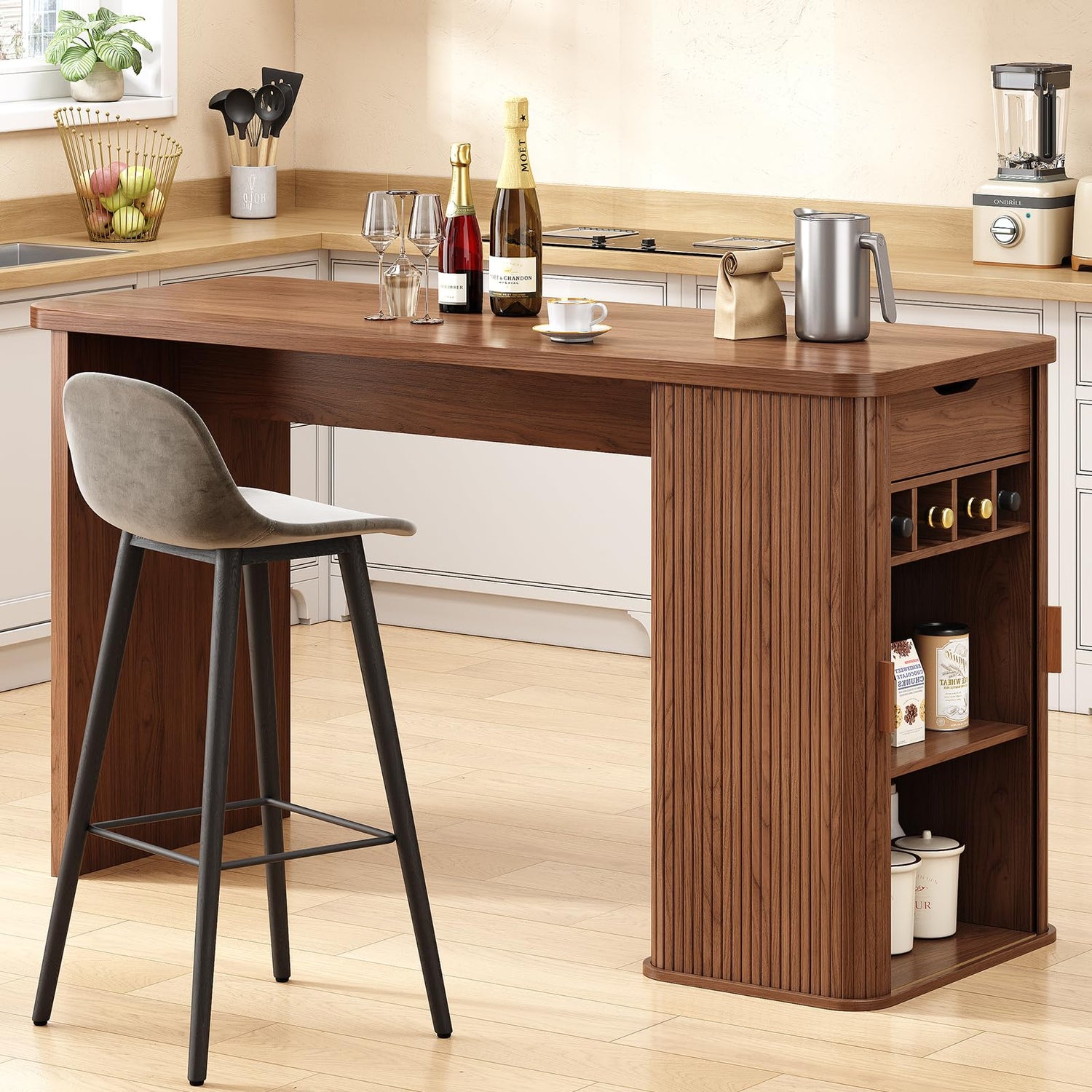ONBRILL 59 Inch Kitchen Island with Storage, Fluted Counter Height Table, Mid-Century Modern Kitchen Island Table with Sliding Door, Home Bar Tables with Wine Rack and Drawers Walnut