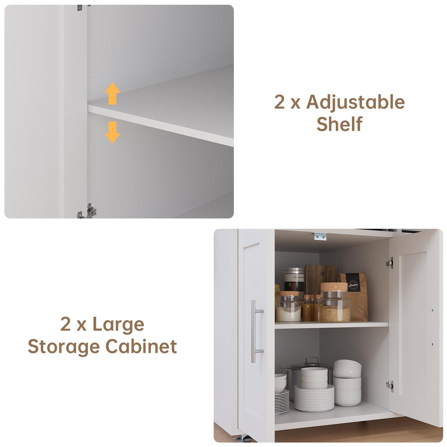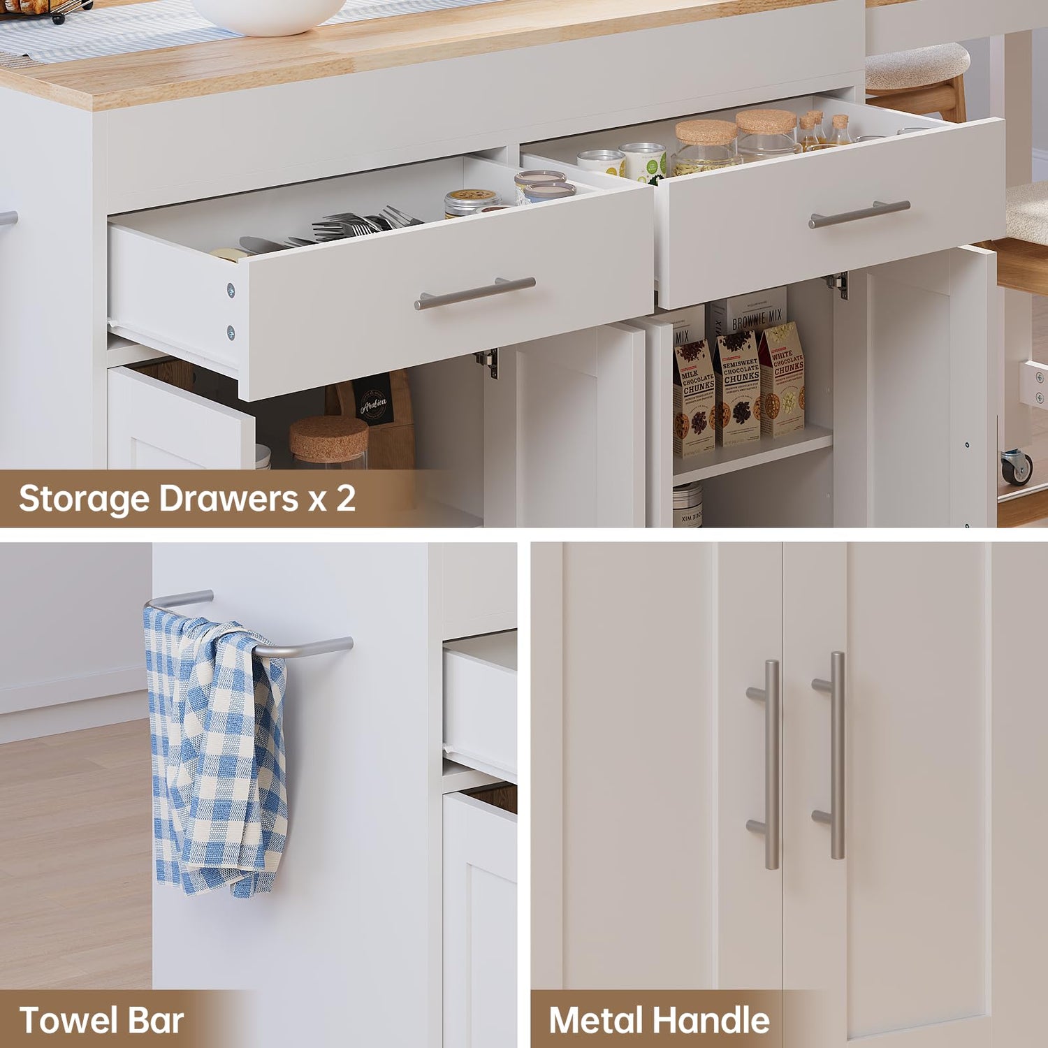 - Double-sized Storage Design: Our kitchen island is an organization with a 4-door cabinet and two oversized drawers. Customizable shelving inside cabinets plus a side spice rack adapt to your storage needs, keeping ingredients, cookware, and utensils within reach yet out of sight.