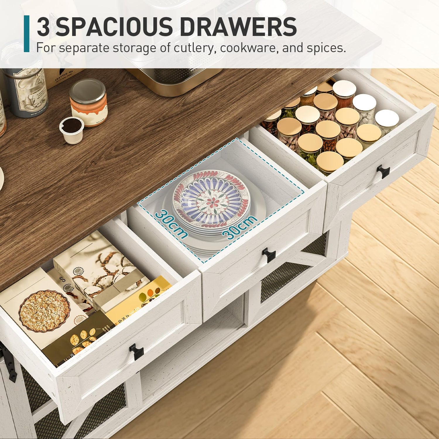 RALGEND Kitchen Island with Storage, Kitchen Cart with Charging Station, Rolling Kitchen Island Table with Drop-Leaf, 3 Drawers, Barn Doors, Towel Rack and Spice Rack, White and Walnut