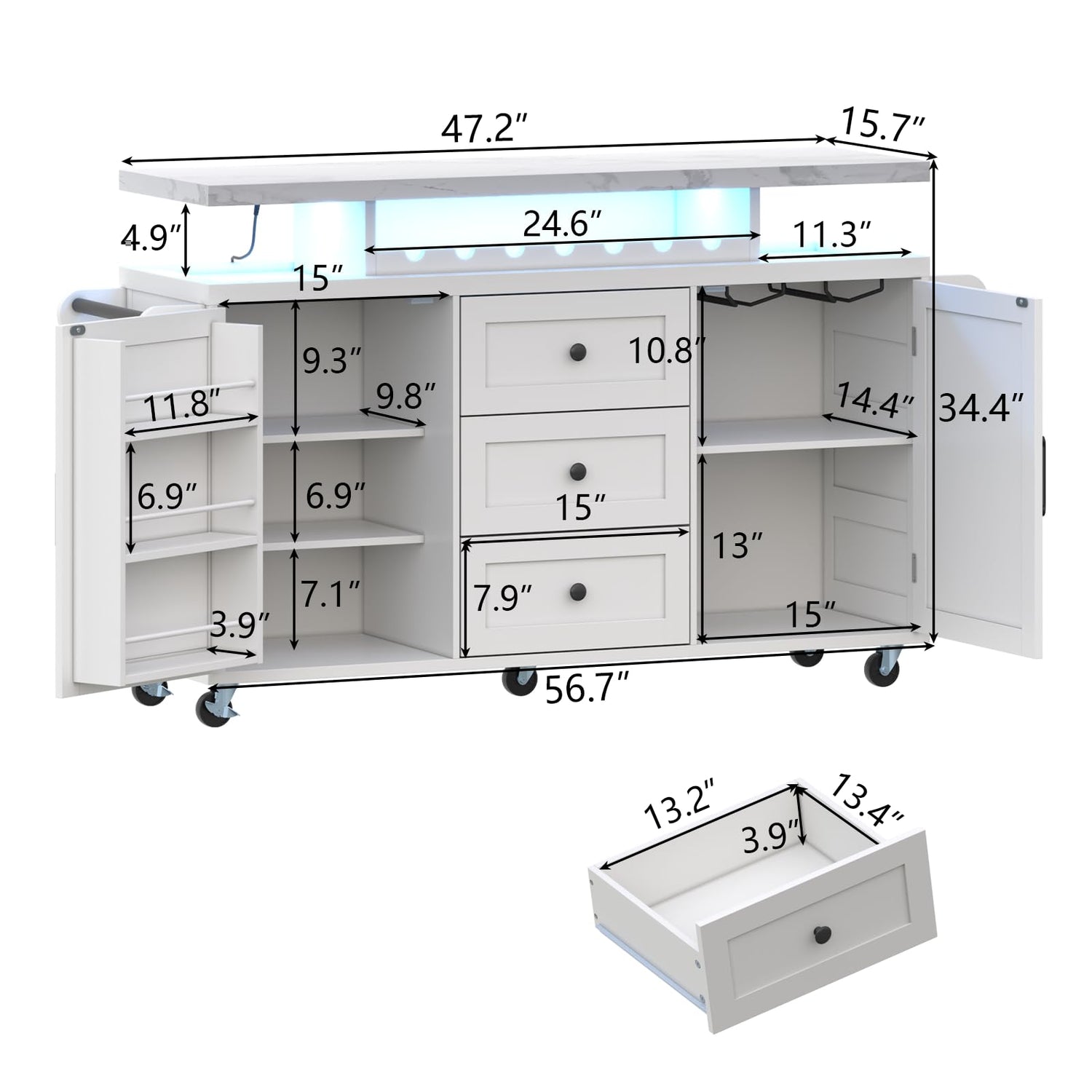 - [Rolling Kitchen Island with Large Storage Space]-The 47.2-inch countertop provides ample space for food preparation. The kitchen island cart on wheels has 3 drawers and a 3-layer door-side storage rack for organised storage of utensils and cookware. Under the countertop is a wine rack holding up to 7 bottles of red wine. Two rows of wine glass holders in the cabinet can hold up to multiple glasses. A spice rack with guards and a towel bar on the sides of the cart make accessing the items you need easy.