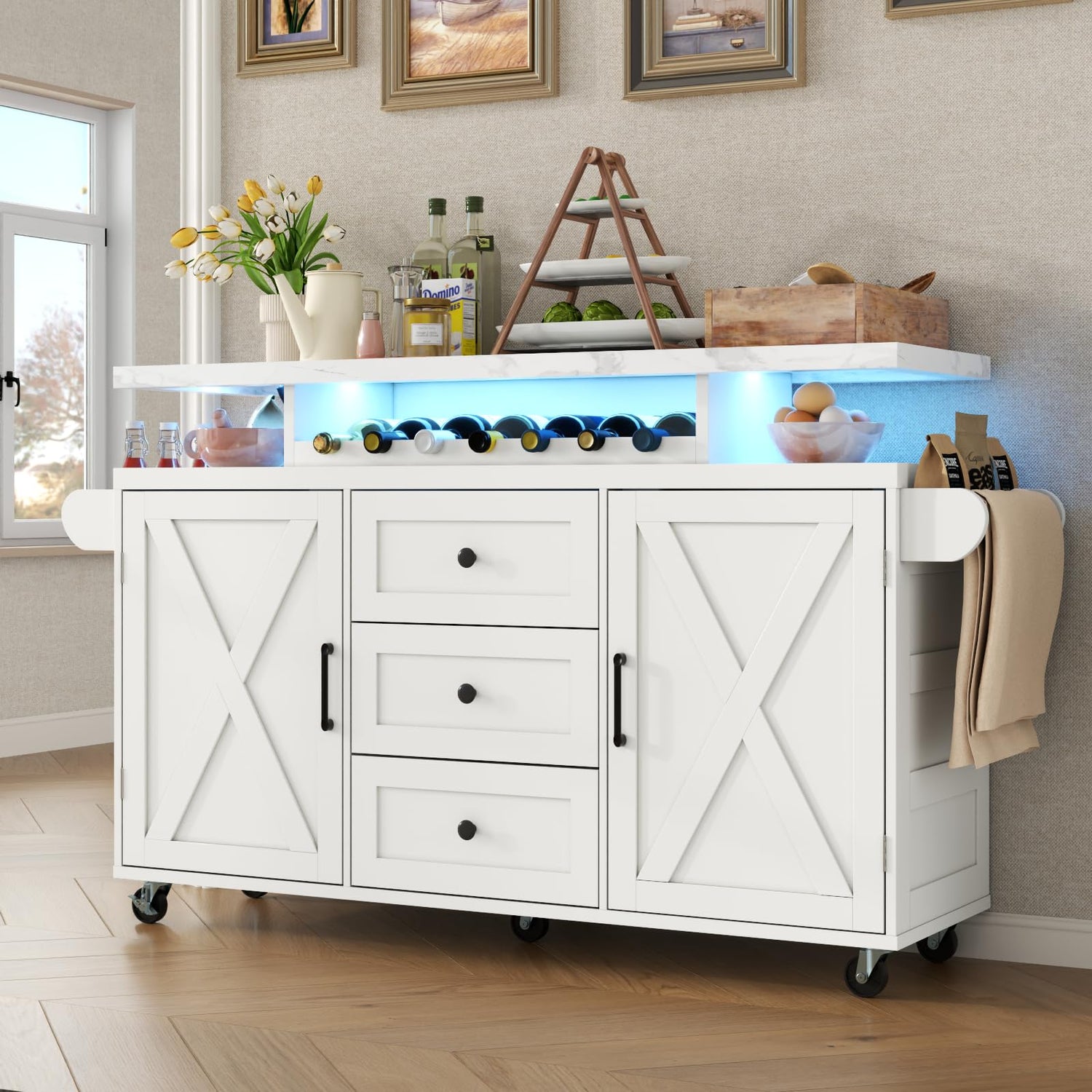 Rolling Kitchen Island Cart with Storage, Kitchen Island on Wheels with LED Lights & 3 Drawers, Side Table with Spice Rack & Towel Rack, Large Mobile Islands Table for Dining Room, White