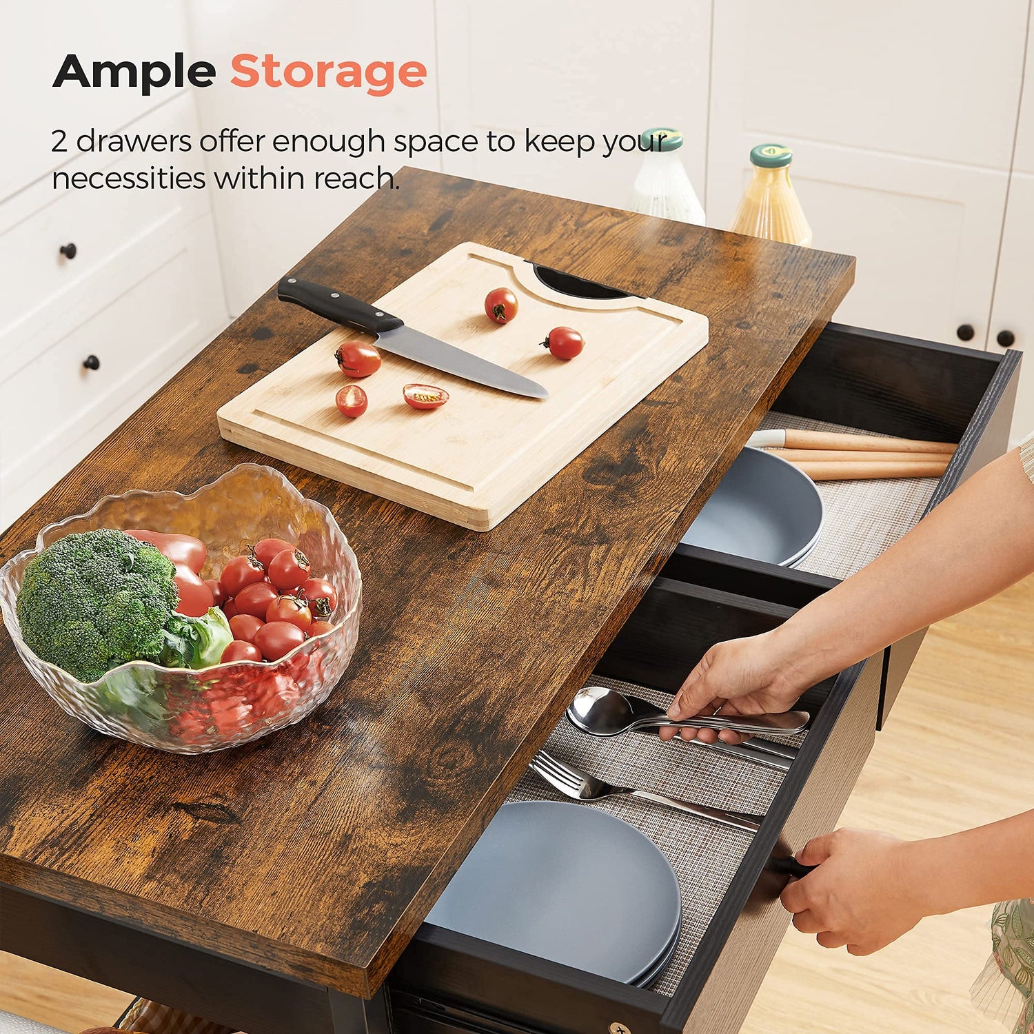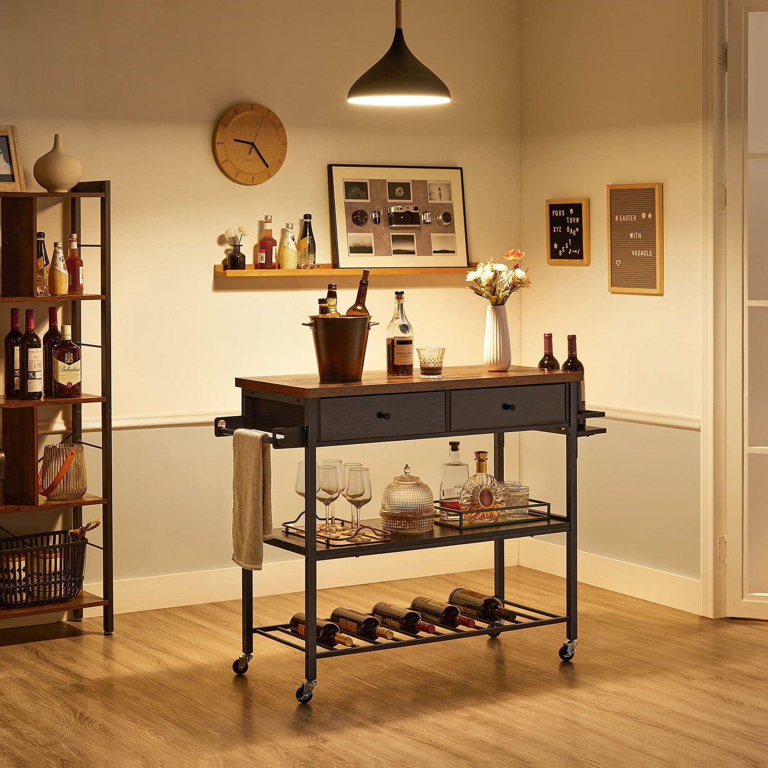 VASAGLE Kitchen Island, Kitchen Cart, 3-Tier Microwave Stand with 2 Drawers, Towel Bar, Spice Holder, 17.7 x 46.9 x 35.8 Inches, Rustic Brown and Black UKKI003B01