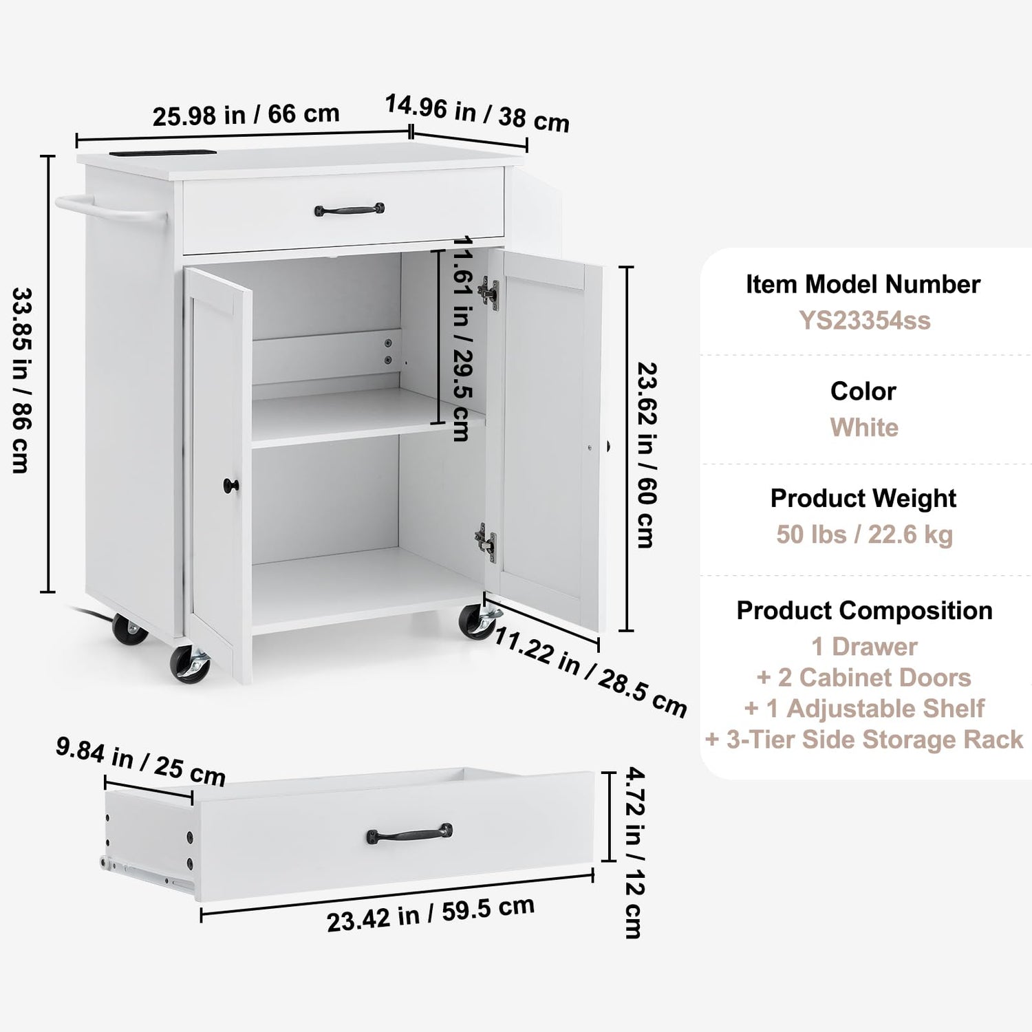 VEVOR Kitchen Island Cart, 32" Mobile Carts with Storage Cabinet, Rolling Table with Power Outlet, Spice Rack, Towel Bar, Adjustable Shelf, Drawer, Dining Living Room Portable Islands on Wheels, White