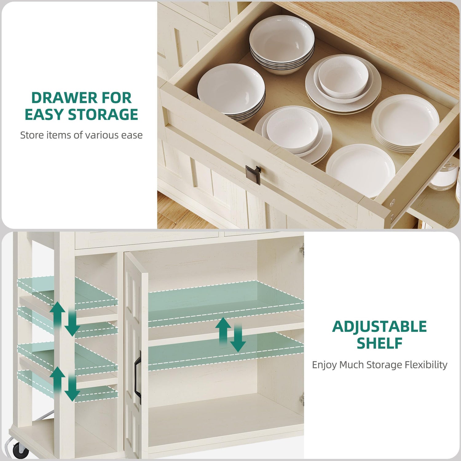 • Spacious Storage Space: Including 2 drawers and a big cabinet for storing utensils, dinnerware and so on, as well as side open shelves for spices. The height-adjustable shelf inside of cabinet doors accommodates various kitchen items