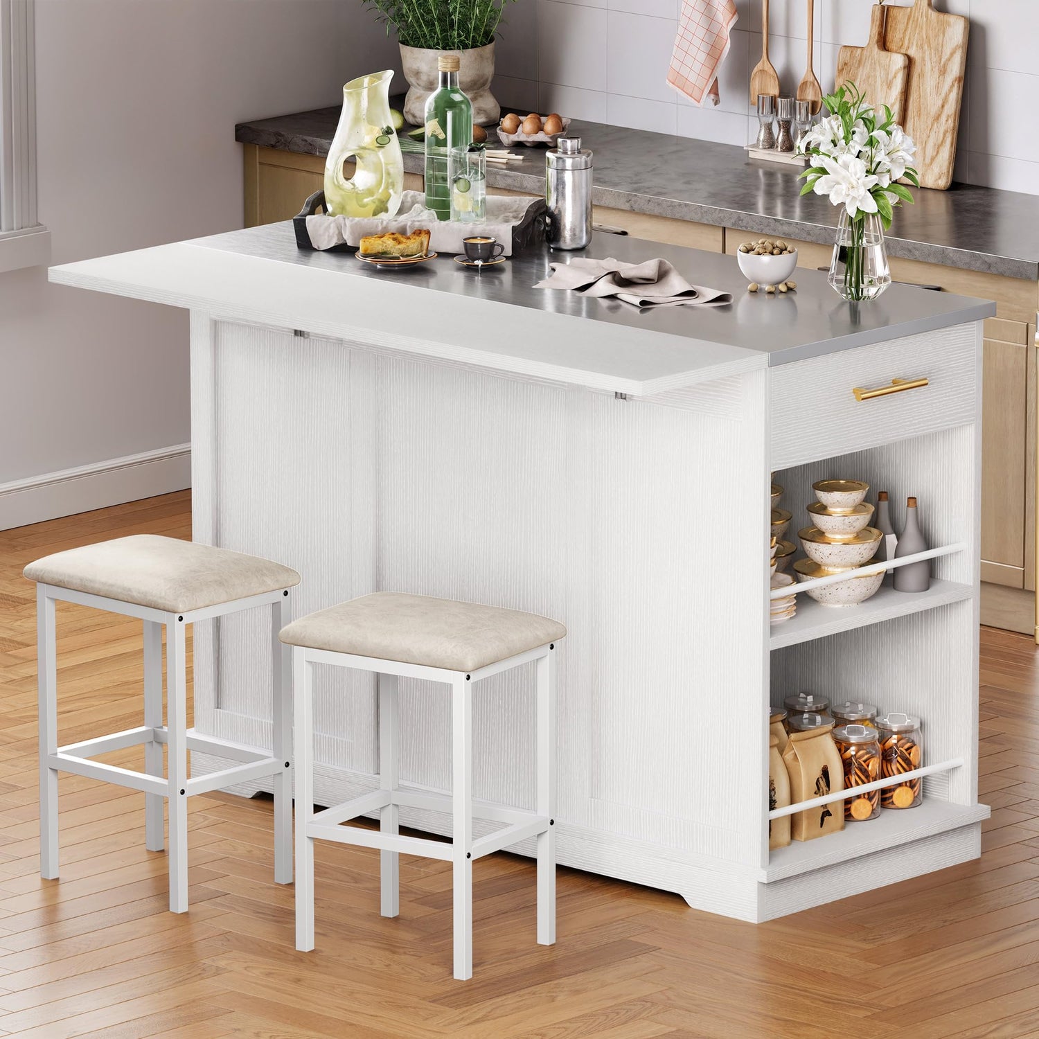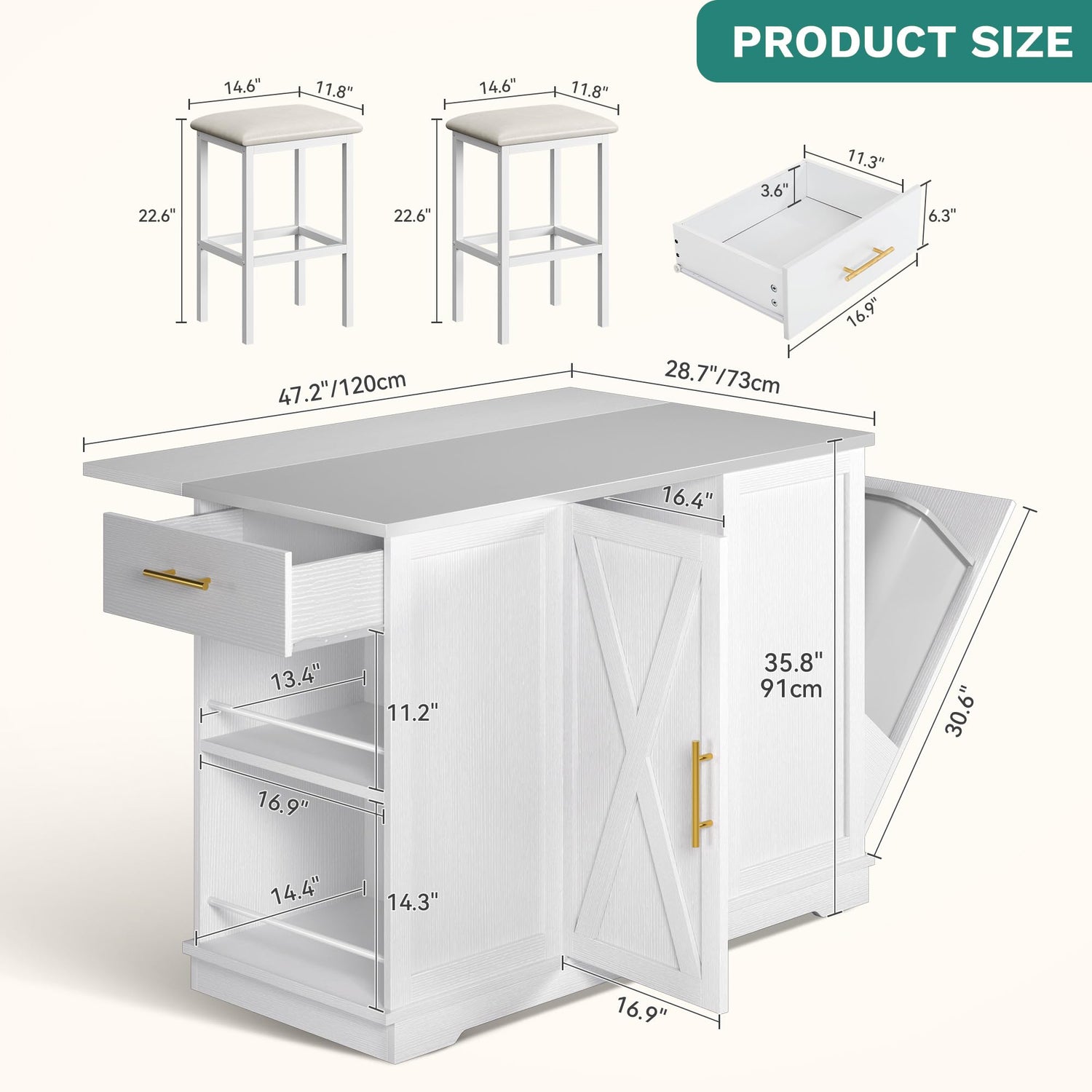 YITAHOME Kitchen Islands with Seating, 47" Mobile Storage Island with Drop Leaf, Rolling Island Table with Tilt Out Trash Can Cabinet, Home Bar Table Include 2 Chairs, Side Spice Rack & Drawer, White