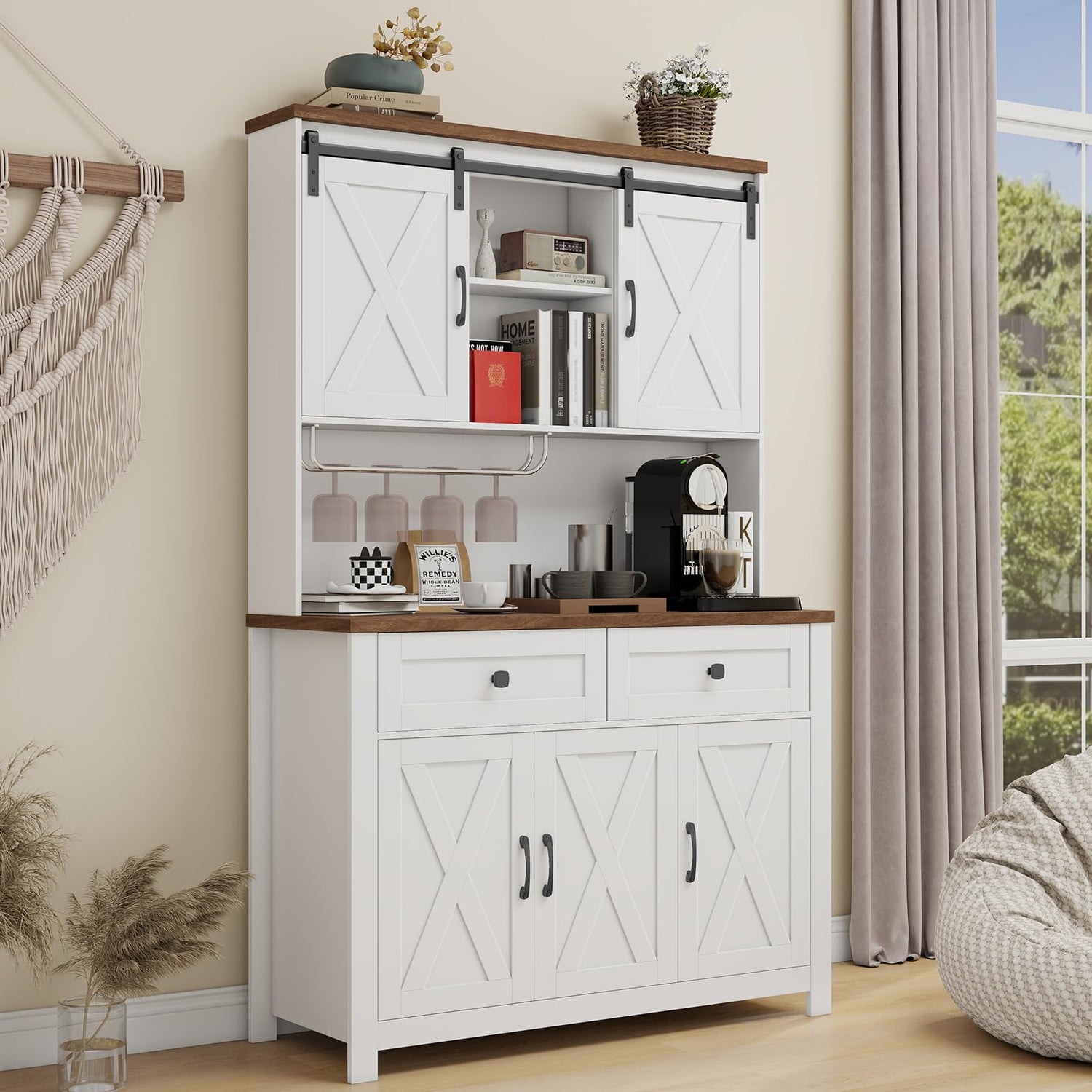 - 【Modern Farmhouse Flair】The farmhouse coffee bar is completed with classic rustic elements like X trim doors, black metal handles and finish in two contrast colors, which is steeped in a rich rustic flair and looks right at most country, cottage or coastal abode. This coffee bar cabinet with storage with 2 sliding barn doors is not only easy to access the items in the cabinet, but also adds a touch of rustic charm to the whole room,beautiful and functional.