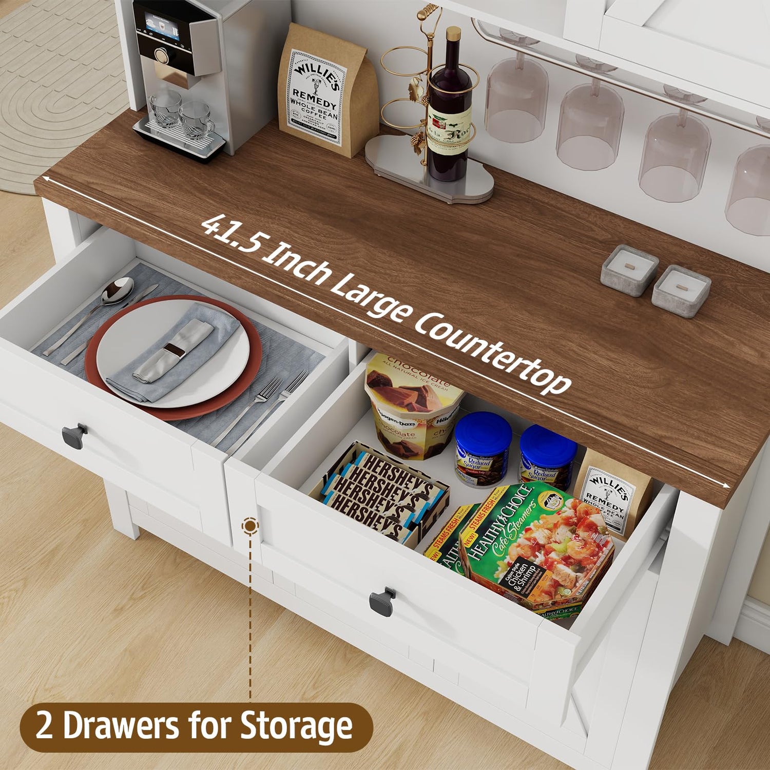 - 【Ample Storage Space】This spacious pantry storage cabinet offers organized storage with its upper cabinets for dinner plates and dishes, a 41.5" bar for small appliances or decorative items, and lower drawers and cabinets for snacks, tableware, and alcohol, ensuring a neat space and easy access to your essentials.