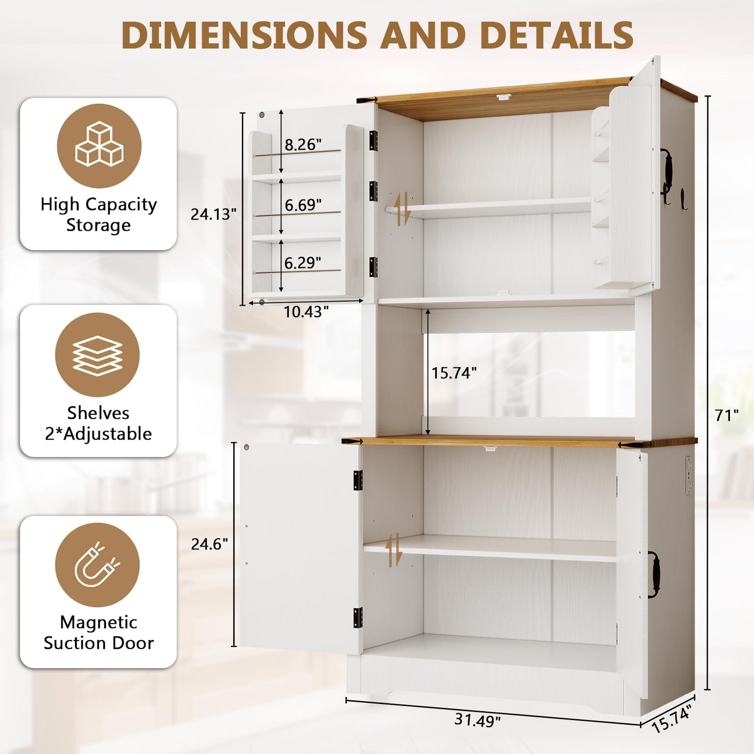 • Ample Storage Capacity: Standing at 71"H × 31.49"W × 15.74"D, this pantry cabinet offers abundant storage for all your needs. It includes 4 shelves (1 adjustable), 6 door racks(great for storing small bottles and jars), and 4 hooks. With spacious open countertop, you can place coffee makers, toasters, microwaves, etc. The top door is equipped with a magnetic locker for convenient closure.