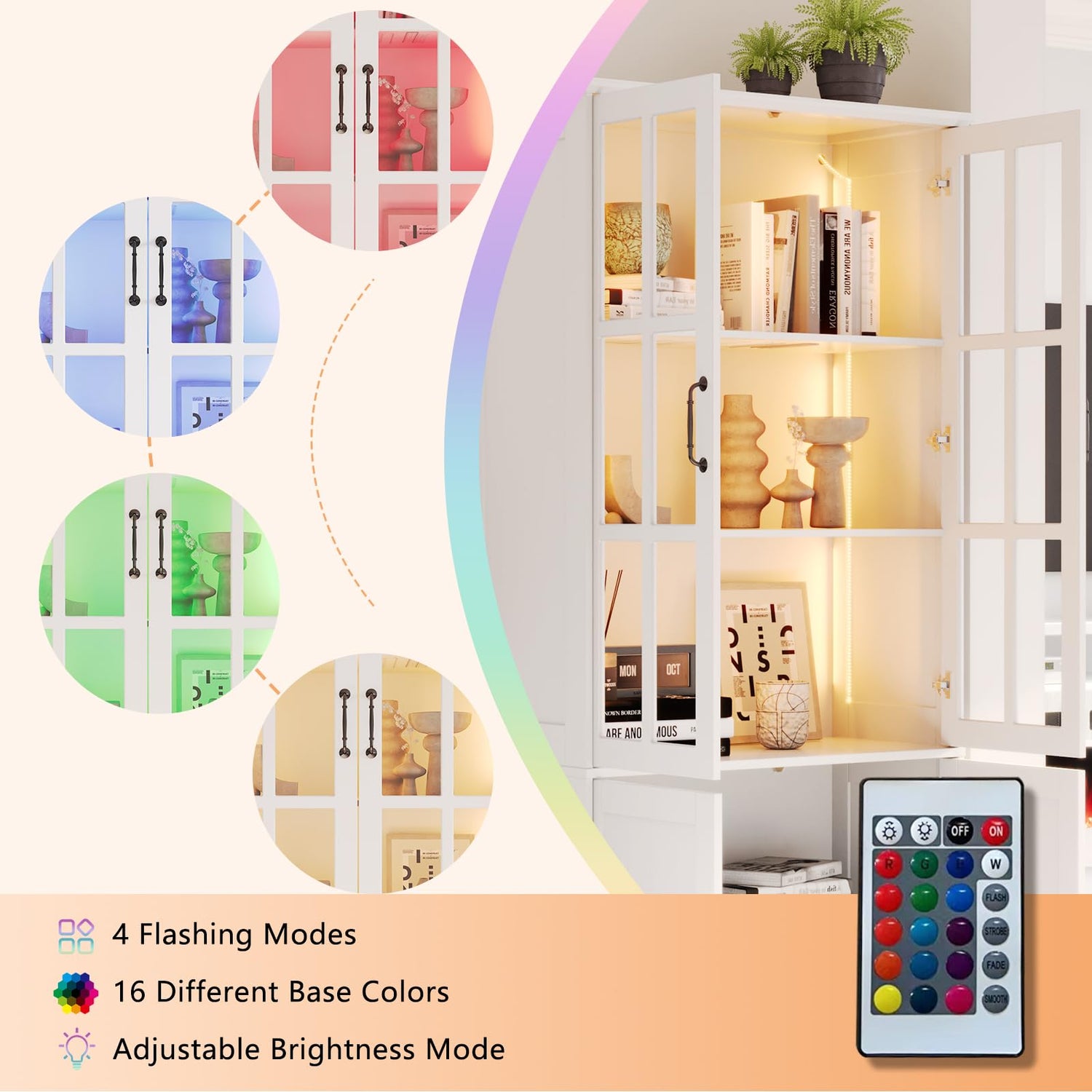 AMERLIFE 71" Tall Storage Cabinet with LED Lights, 5 Tier Large Modern Wood Kitchen Pantry with Acrylic Glass Doors & Shelves, Display Cabinet for Living room, Dining room, Bathroom, 4 Doors White