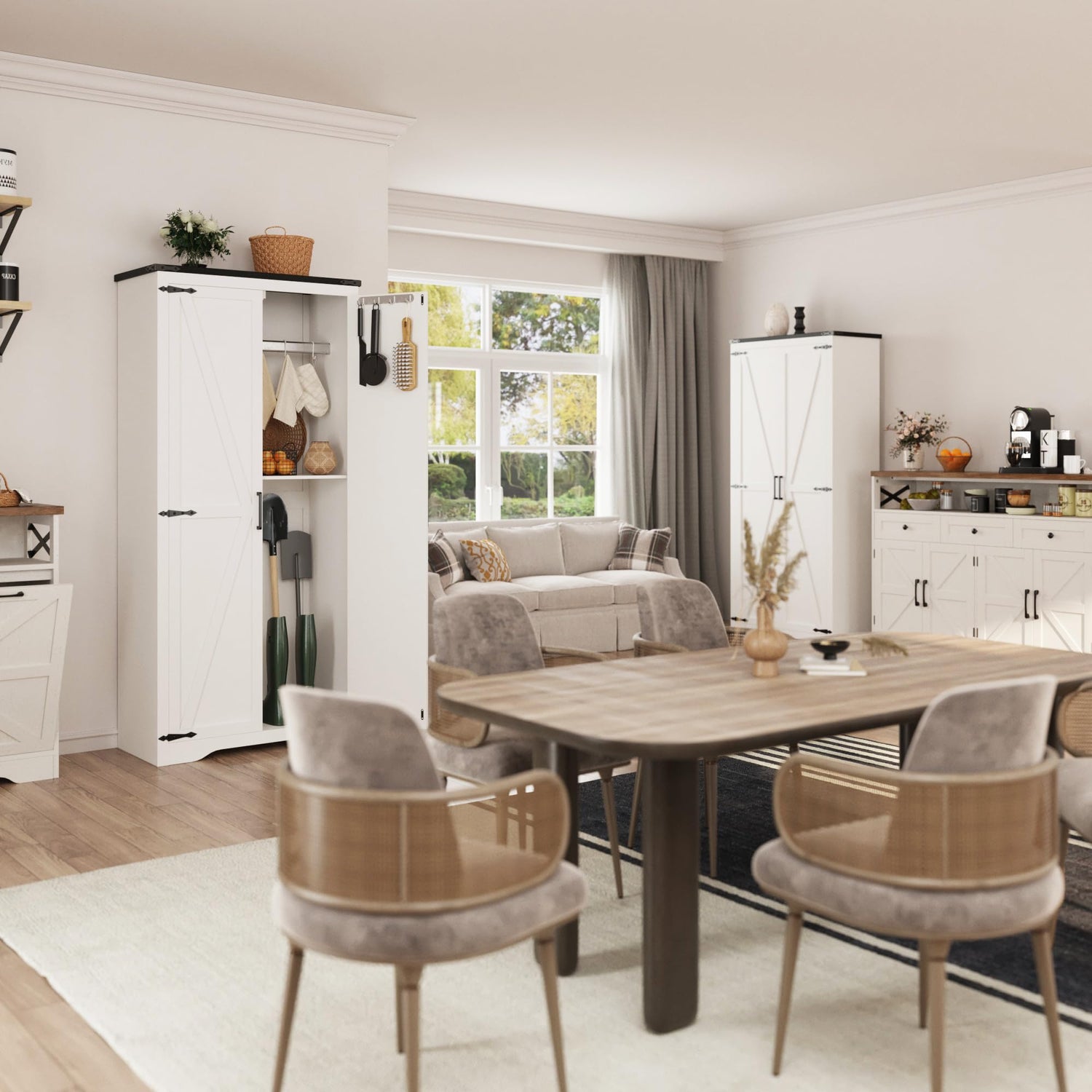 - 【Rustic Farmhouse Design】 This kitchen pantry storage cabinet features a rustic wood finish and black metal accents, perfectly blending modern rusticity with vintage farmhouse charm. It's the perfect way to add elegance to your kitchen or living room and will complement any furniture and decorated style. This cabinet serves as a stunning addition that ties your home together.