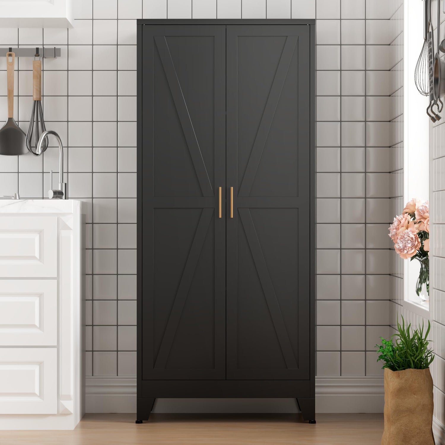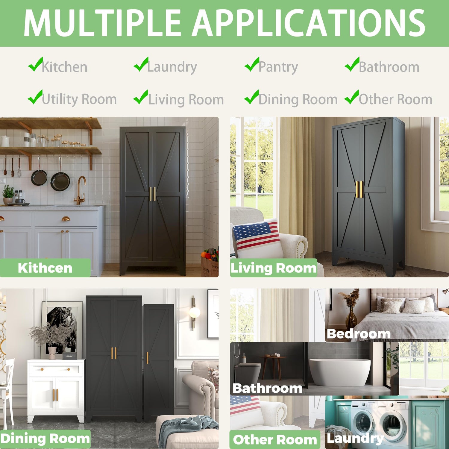 COFaR Black Farmhouse Storage Kitchen Pantry Cabinet with 2 Barn Door, 4 Adjustable Shelves and Legs, for Cupboard/Dining Room/Bathroom/Living Room/Office/Laundry Room (Black, 71" Farmhouse)