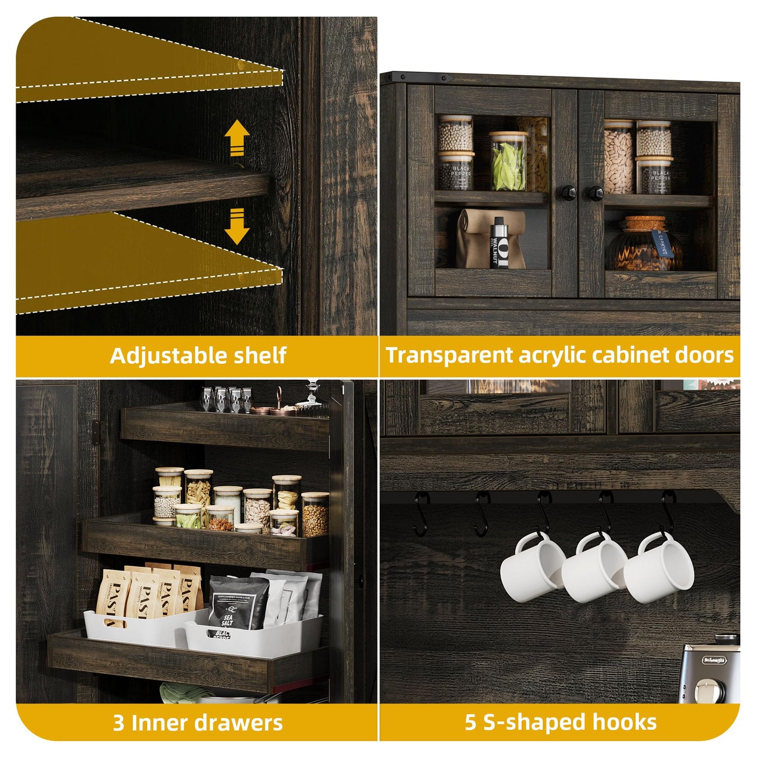 • Tidy Living Awaits: Our cupboard cabinet features acrylic doors for display. The spacious enclosed cabinet below - includes 3 pull-out shelves and a compact closed cabinet with adjustable shelf, keeping dry goods and canned foods protected from dirt