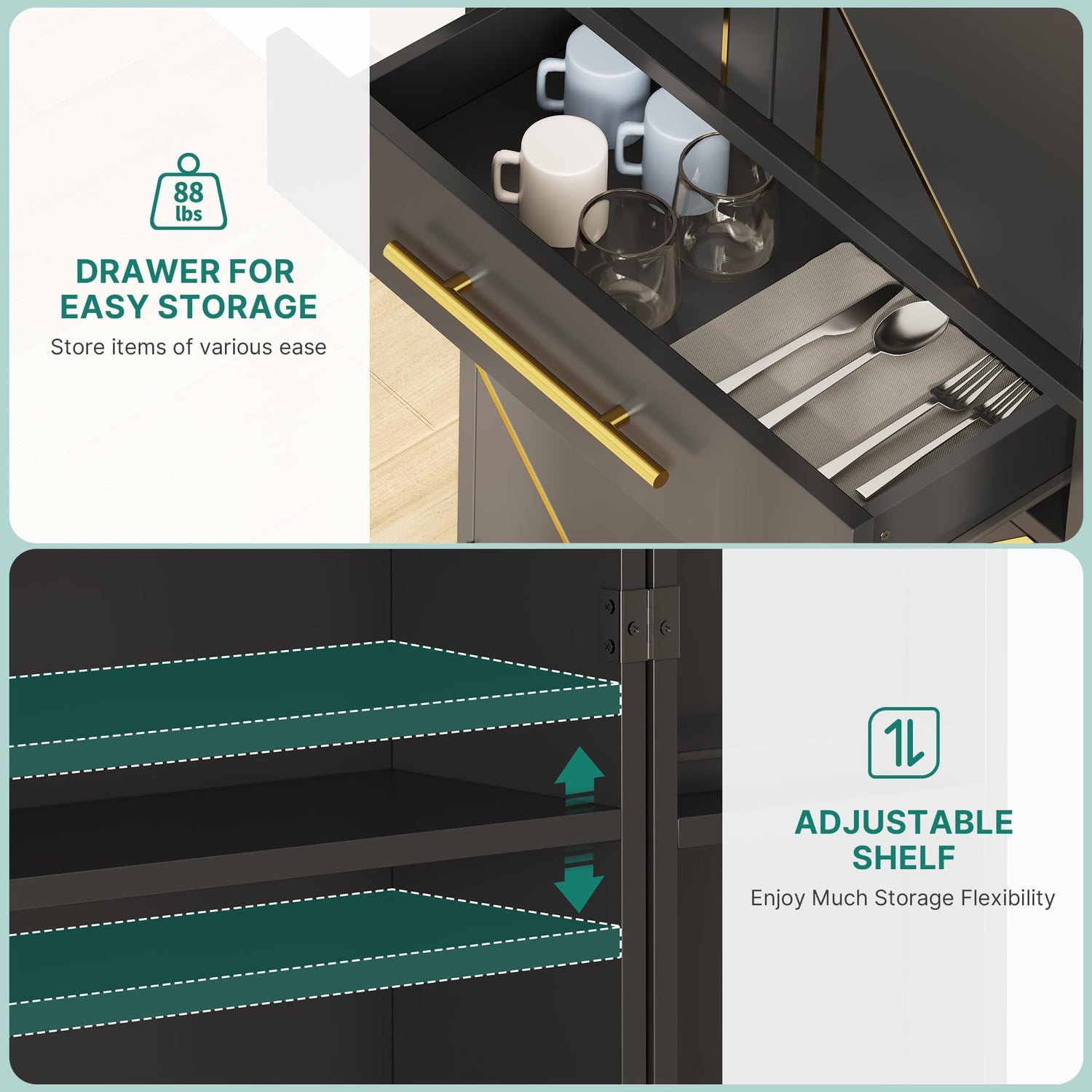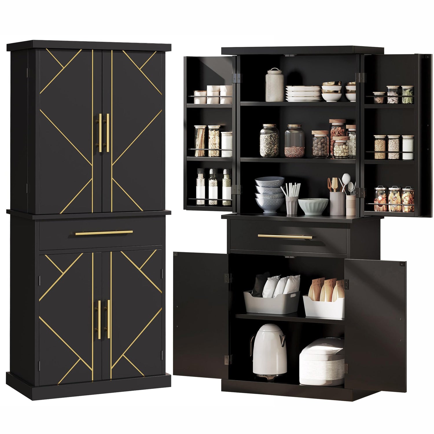 - Multipurpose Kitchen Pantry: Unique designed cabinet doors, golden handles, and golden sleek lines make a modern-style storage cabinet, suitable for for kitchen, living room, hallway, laundry or dining room etc.