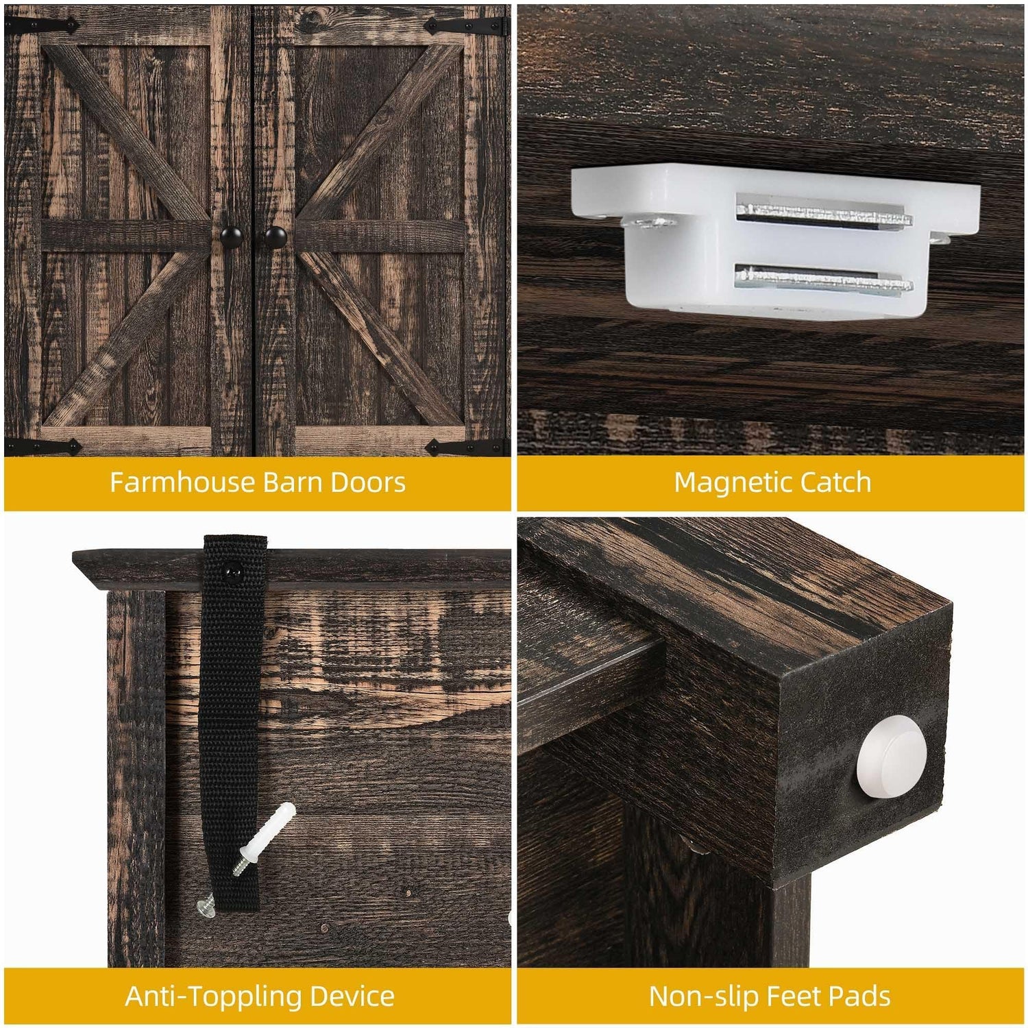 - Charming Farmhouse Style: The tall pantry cabinet combines modern rustic style with vintage farmhouse charm, featuring a sleek finish and barn-door design accented by black metal. Suitable for contemporary or vintage-inspired homes, this cabinet complements various aesthetics and showcases impeccable taste