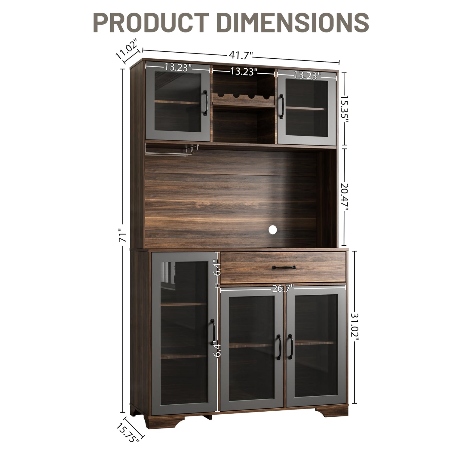 Fatmok Kitchen Pantry Cabinet, 71" Tall Liquor Cabinet with Glass Doors, Adjustable Shelves, Drawer, Coffee Bar Wine Cabinet with LED Lights, Power Outlet & Wine Rack, Buffet Cabinet with Storage