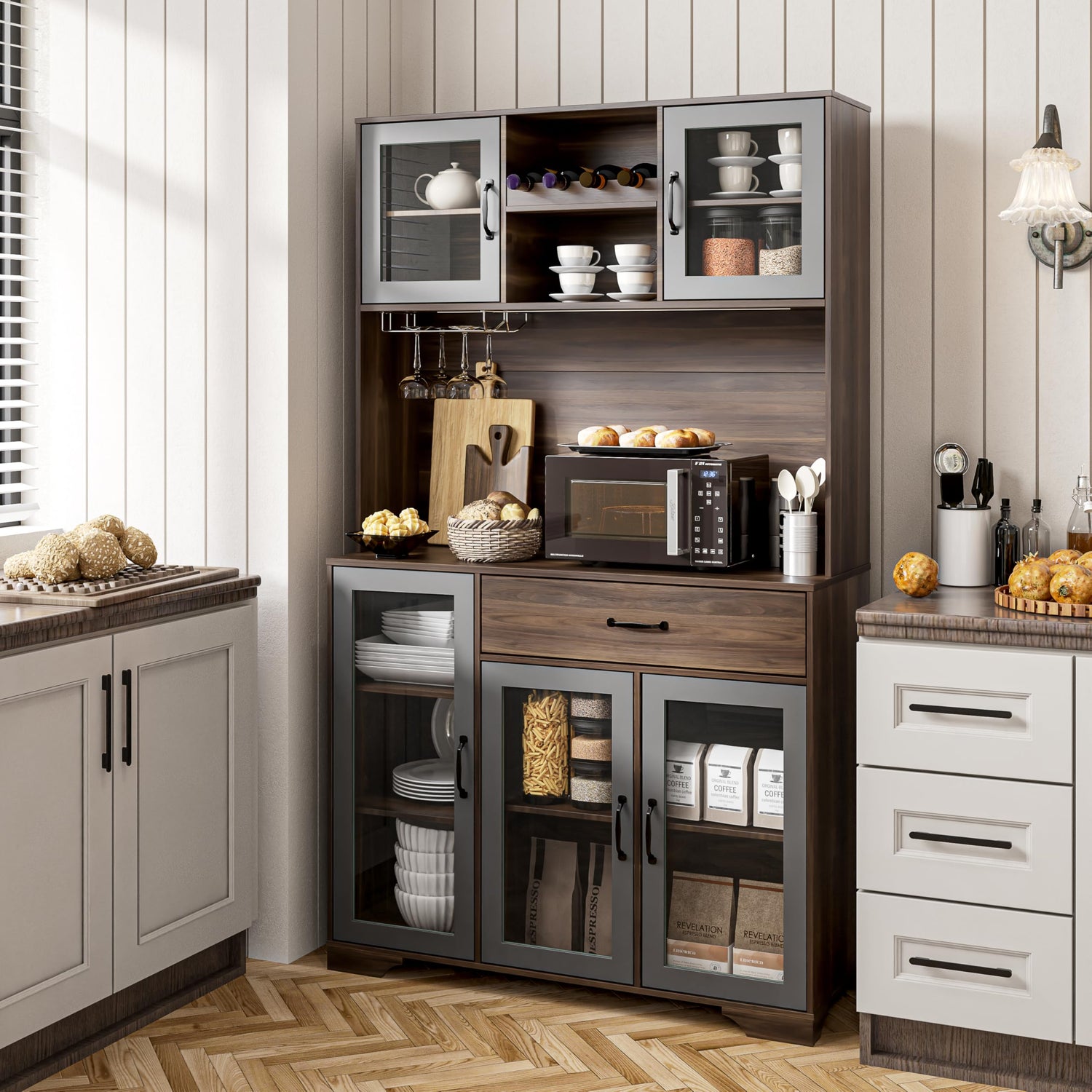 - 【Multi-functional】: The wooden versatile storage cabinet can be used not only as a kitchen hutch cupboard but also as buffet sideboard in the dining room, or be used as coffee bar wine cabinet, liquor cabinet, display cabinet, bookcase, etc., in the living room. with a rustic wood grain finish which allows this storage cabinet to go well with any furnishing style.