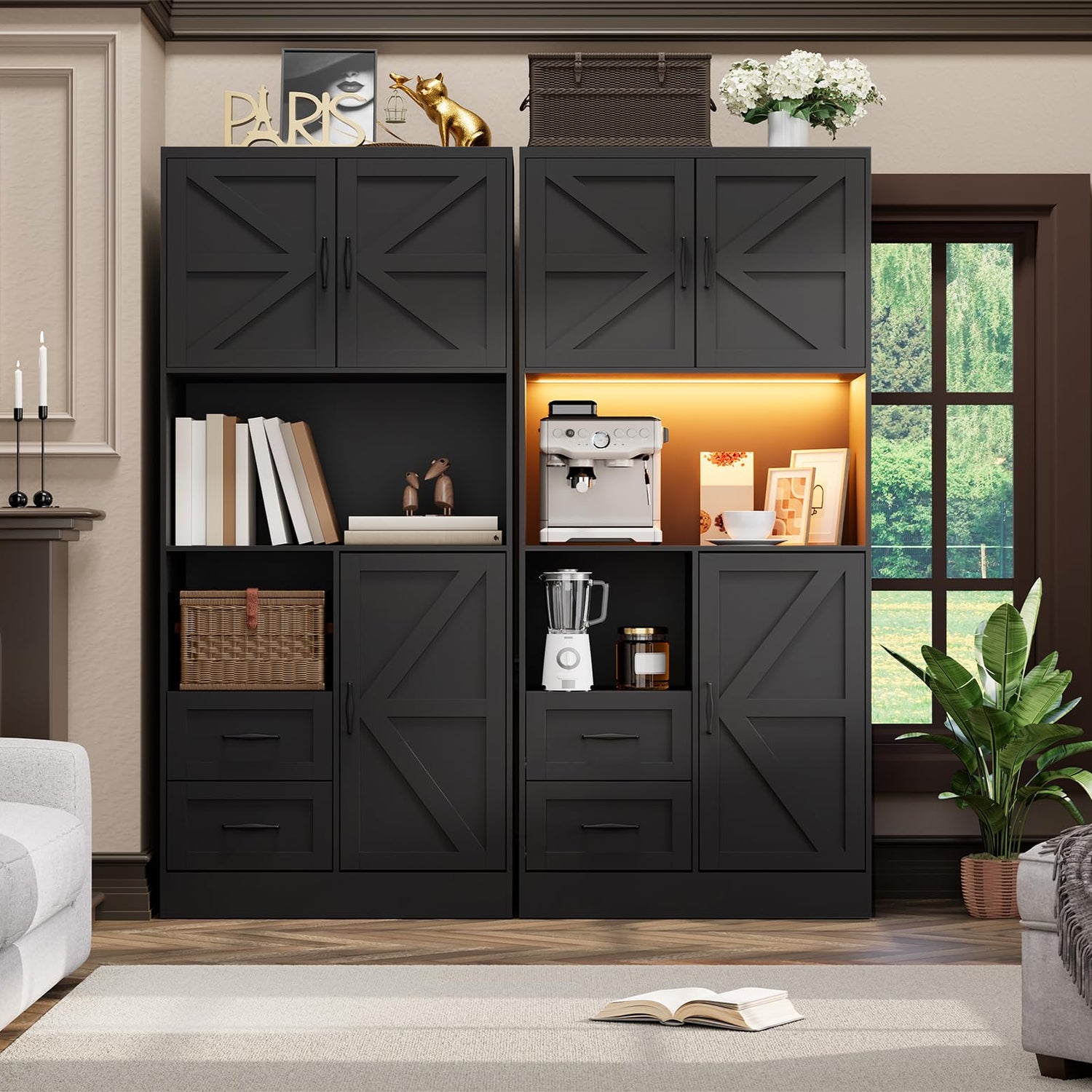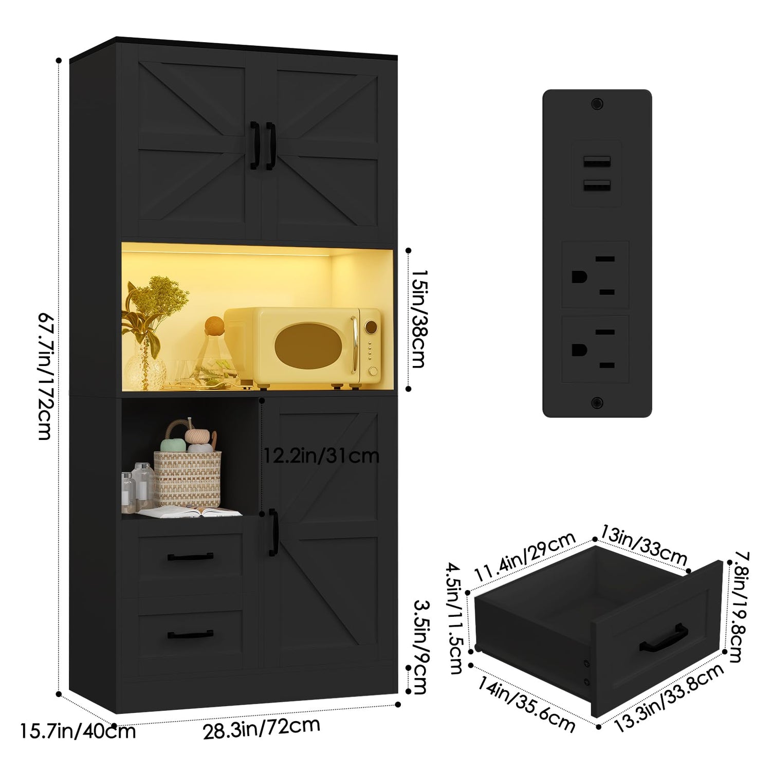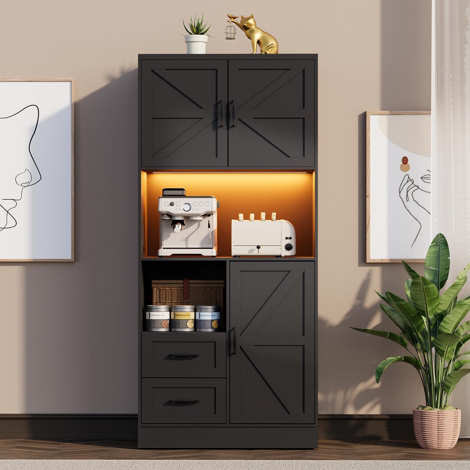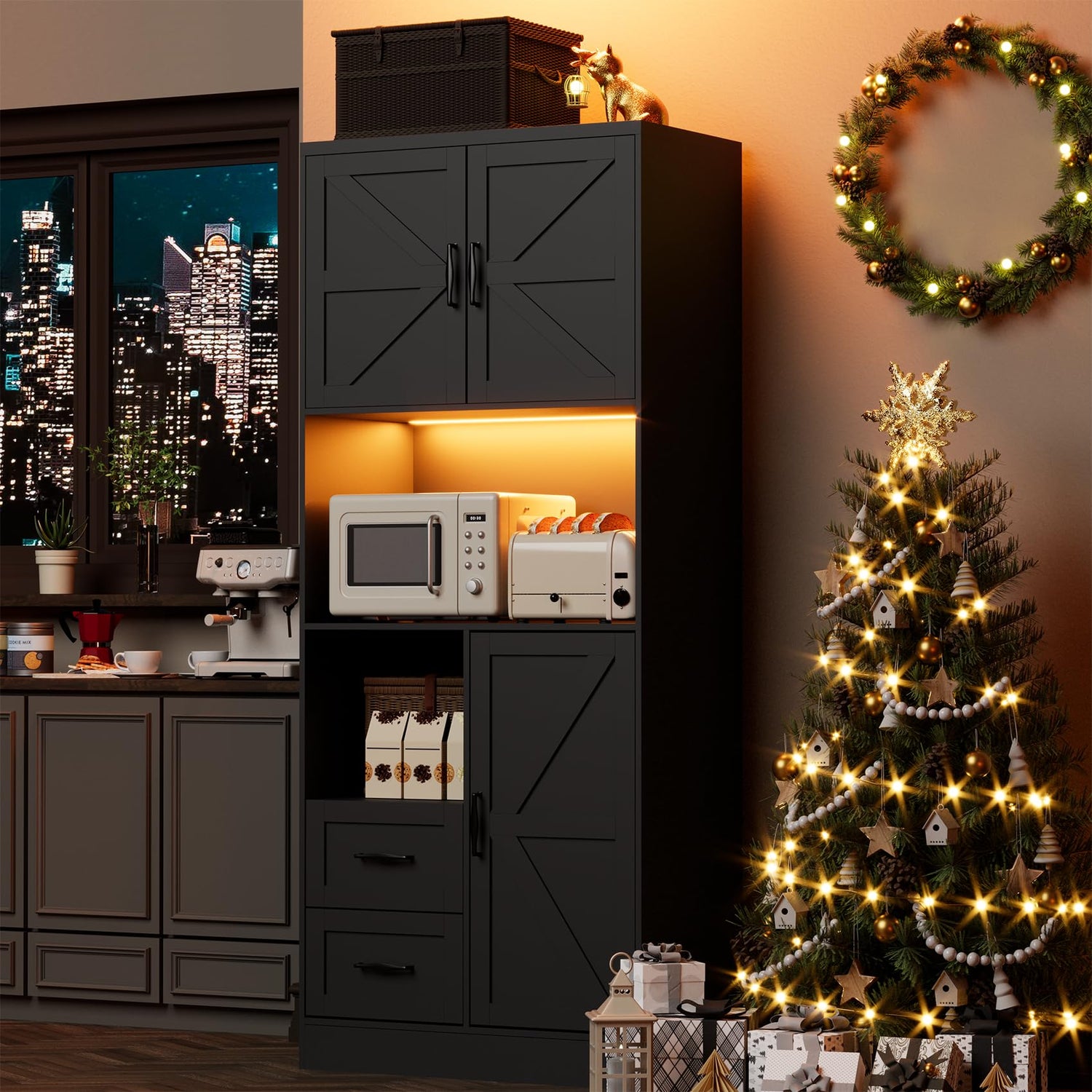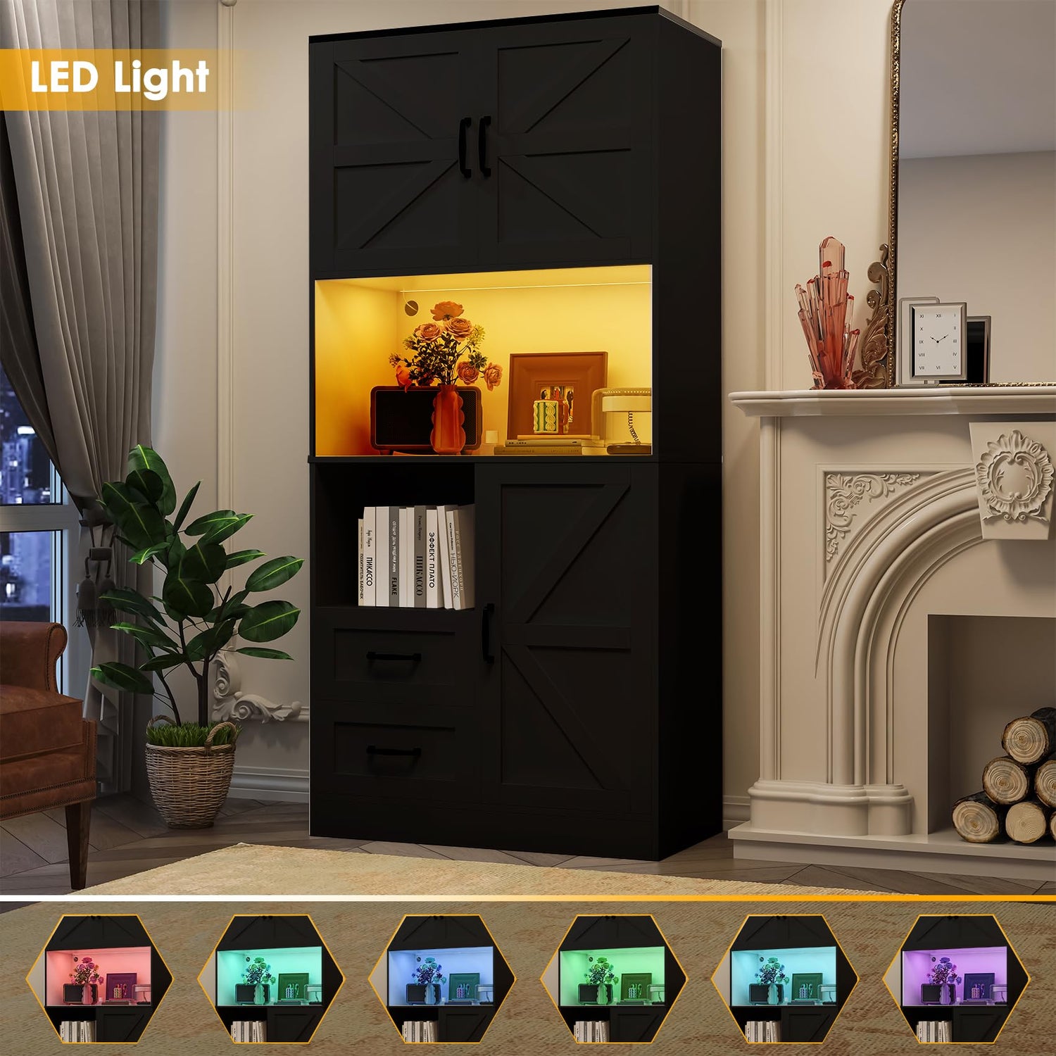 Frmobepts Kitchen Pantry Storage Cabinet with LED Lights and Power Strip, Tall Farmhouse Kitchen Pantry with Barn Doors and Drawers, Adjustable Shelves for Dining Living Room (Black)