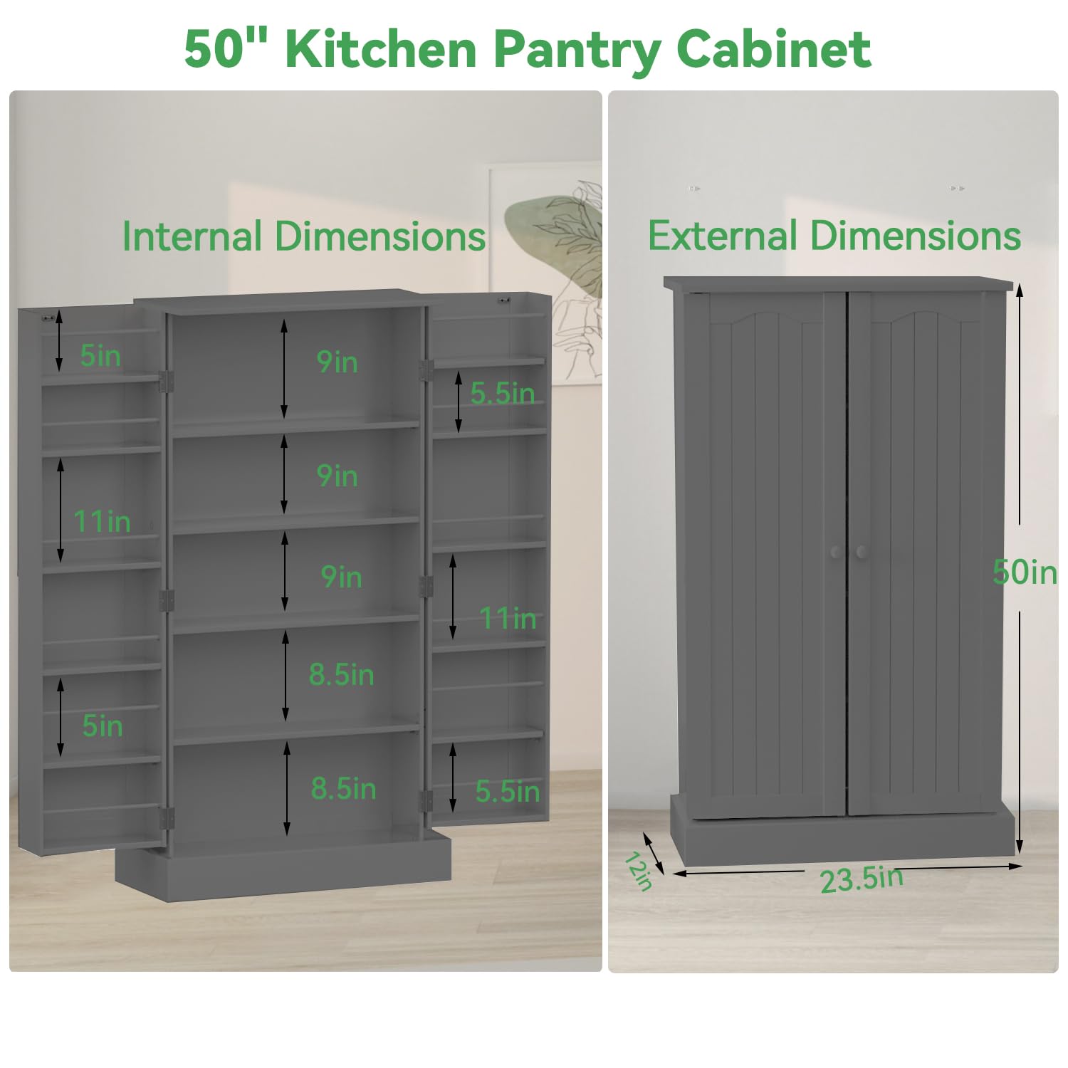 GEPELCN 50" LED Kitchen Pantry Cabinet Grey Storage Cabinet Food Pantry with Doors and Adjustable Shelves Freestanding Buffet Cupboards Sideboard for Kitchen Living Room and Dinning Room