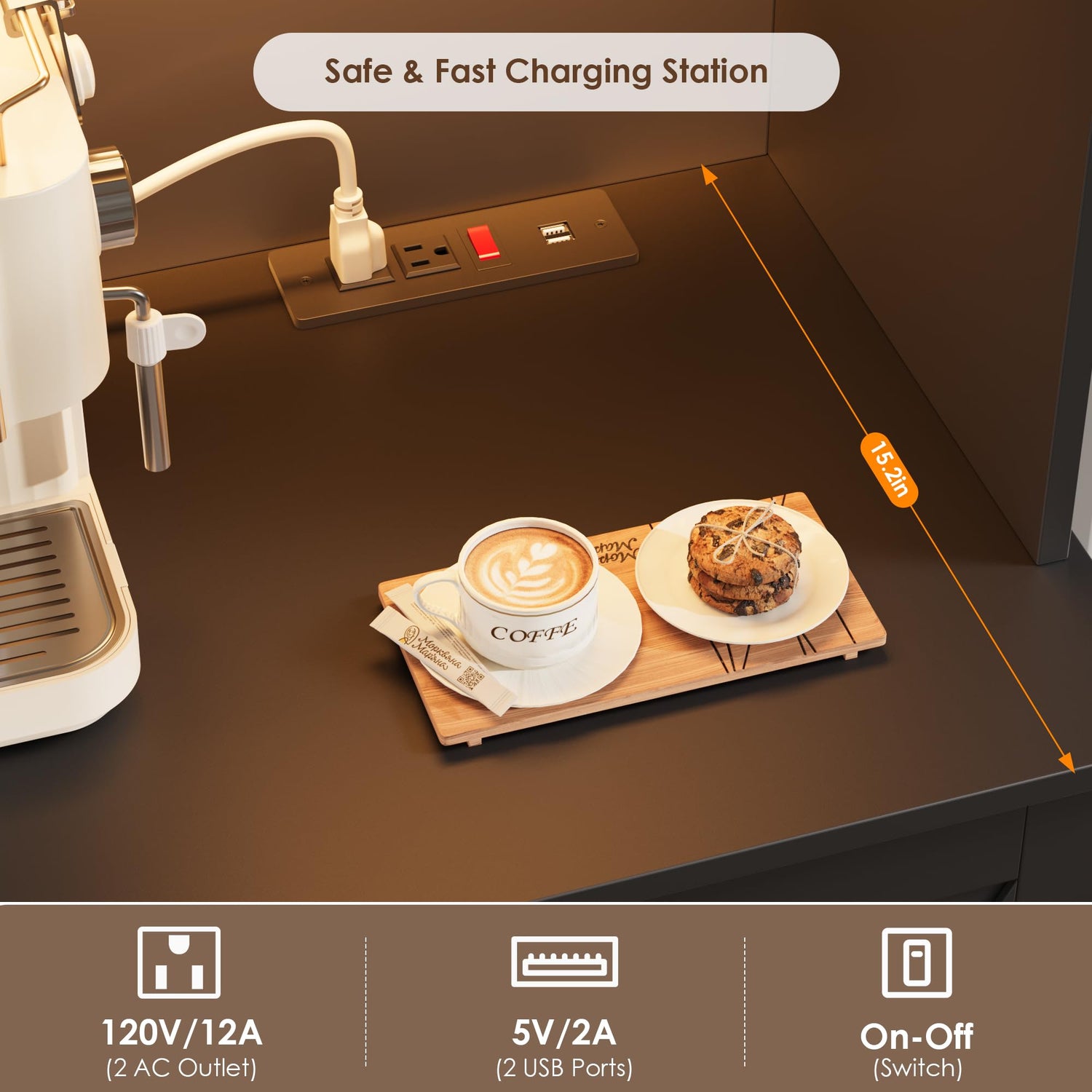 - SPACIOUS COUNTERTOP WITH CHARGING STATION: The kitchen pantry cabinet features a spacious 55.1" wide countertop with a built-in charging station with 2 AC outlets, 2 USB ports, and a handy switch, offering power for a coffee maker, microwave, and other appliances. This is a kitchen cabinet that combines large storage capacity, lighting, and charging functions