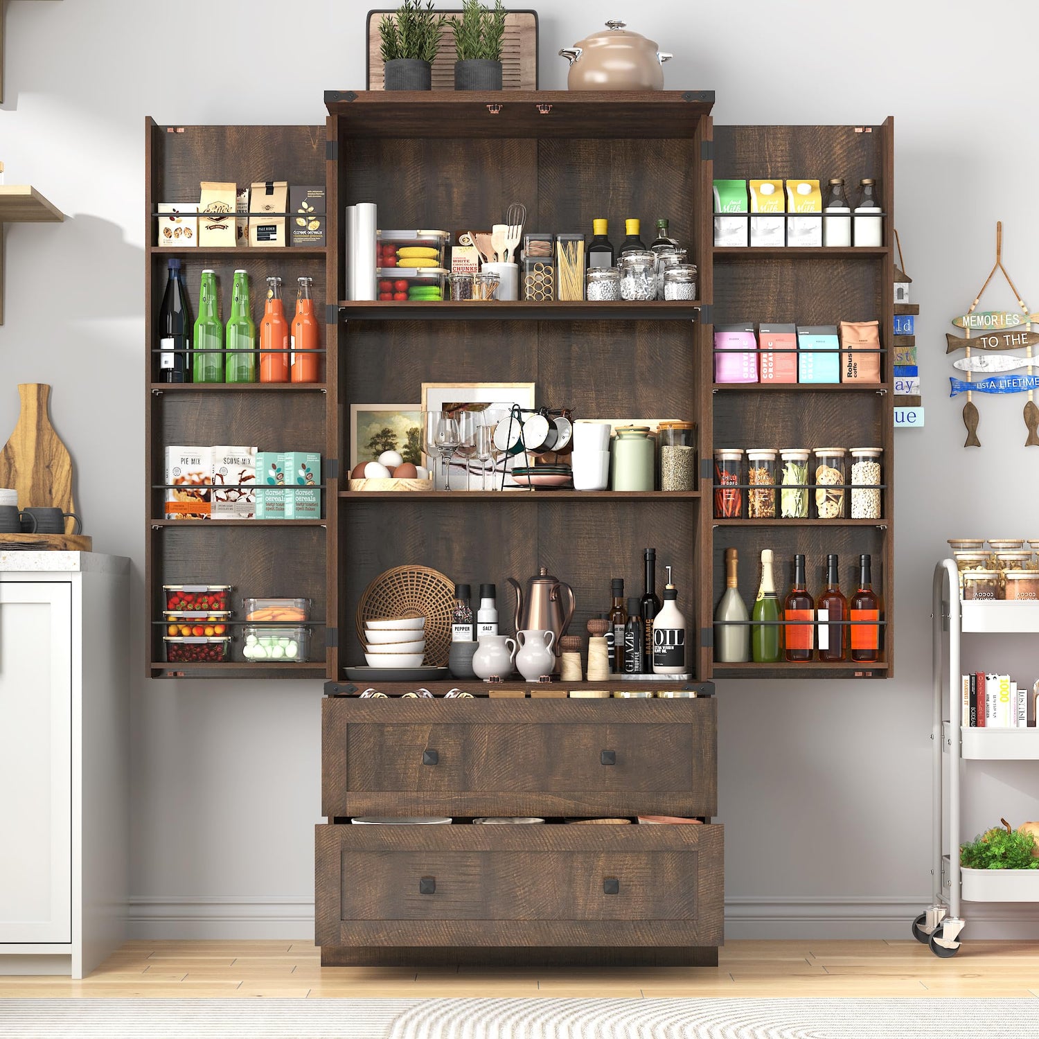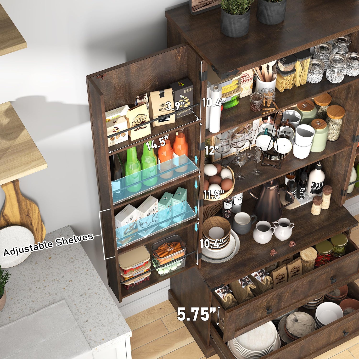 - Add Rustic Elegance: The rustic style of this tall pantry storage cabinet brings a modern country feel to your space. Decorated with barn doors and featuring a distressed rustic brown finish, the kitchen cabinet's matte iron-toned metal accents add a sophisticated edge, enhancing its overall visual appeal