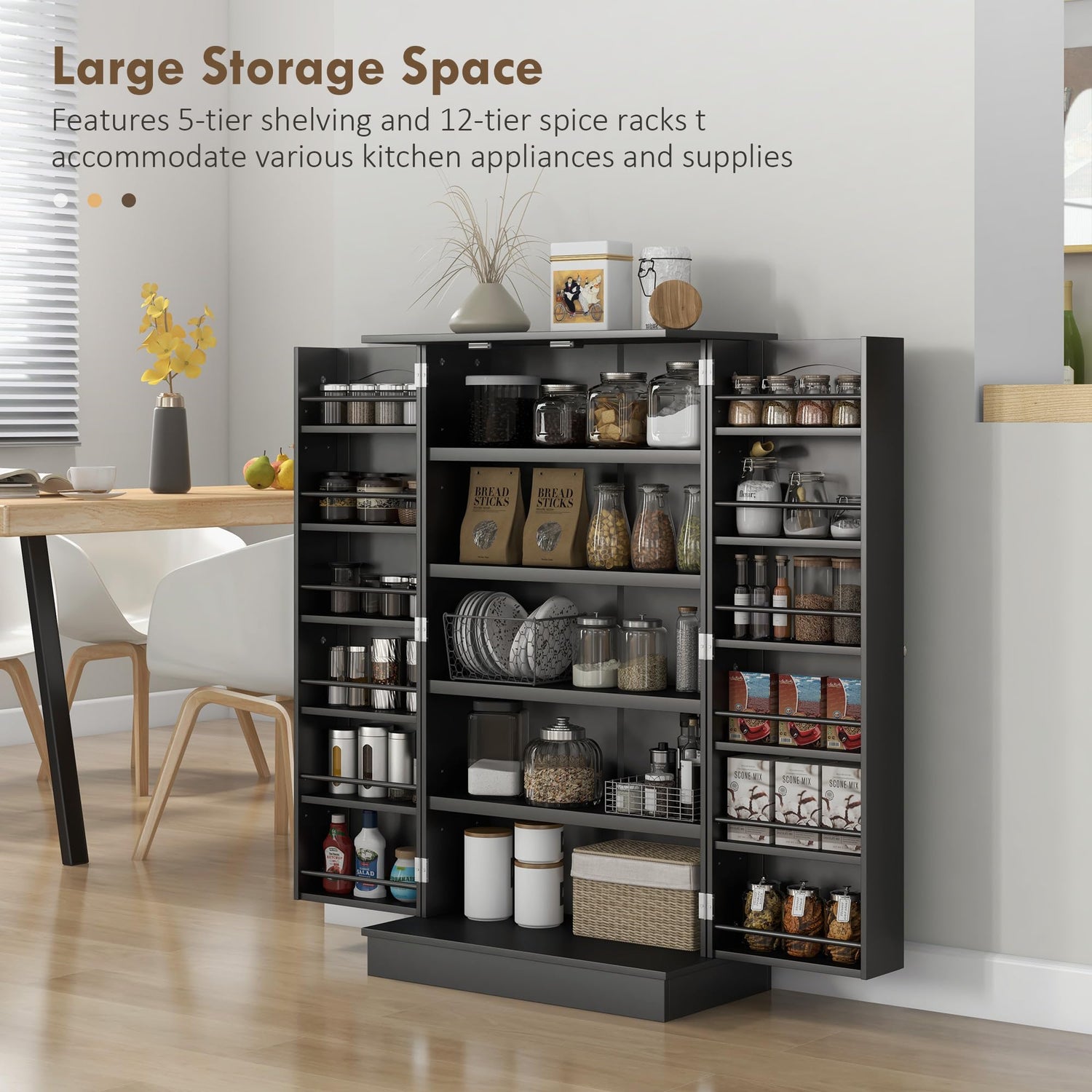 - Upgrade Your Storage: Featuring 5-tier interior shelving and 12-tier side racks behind the doors, this pantry cabinet gives you plenty of room for dishes, cookbooks, pots and pans, spice jars. Meanwhile, the side racks are designed with bars to prevent items from falling over. If you have taller items, the adjustable shelves can be customized to fit items like pitchers, pasta containers and blenders.