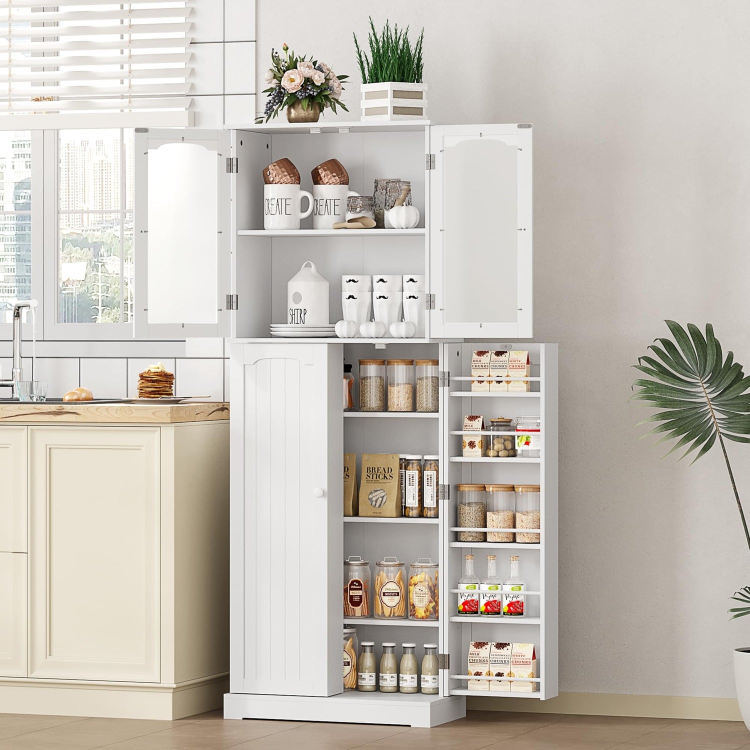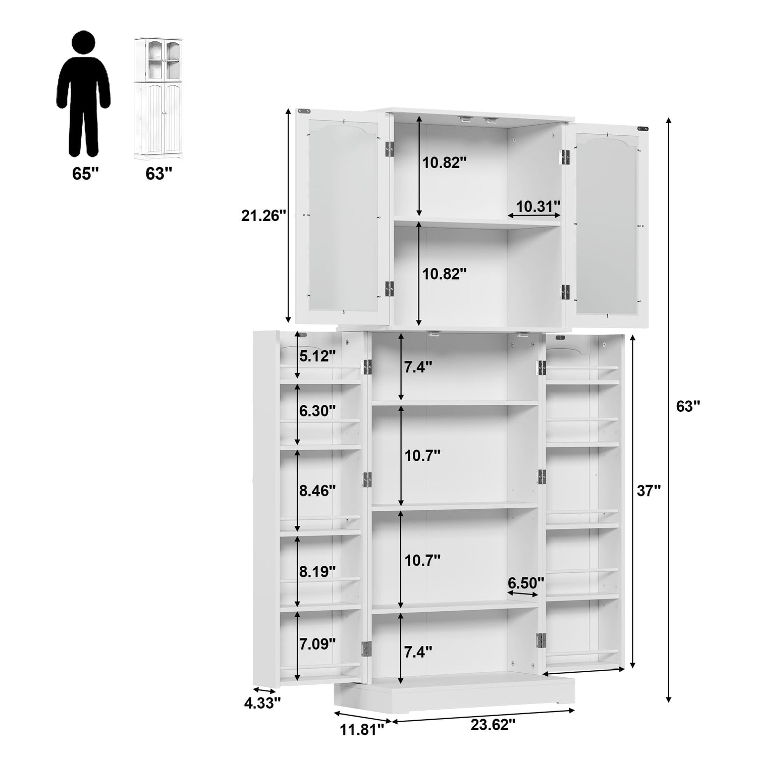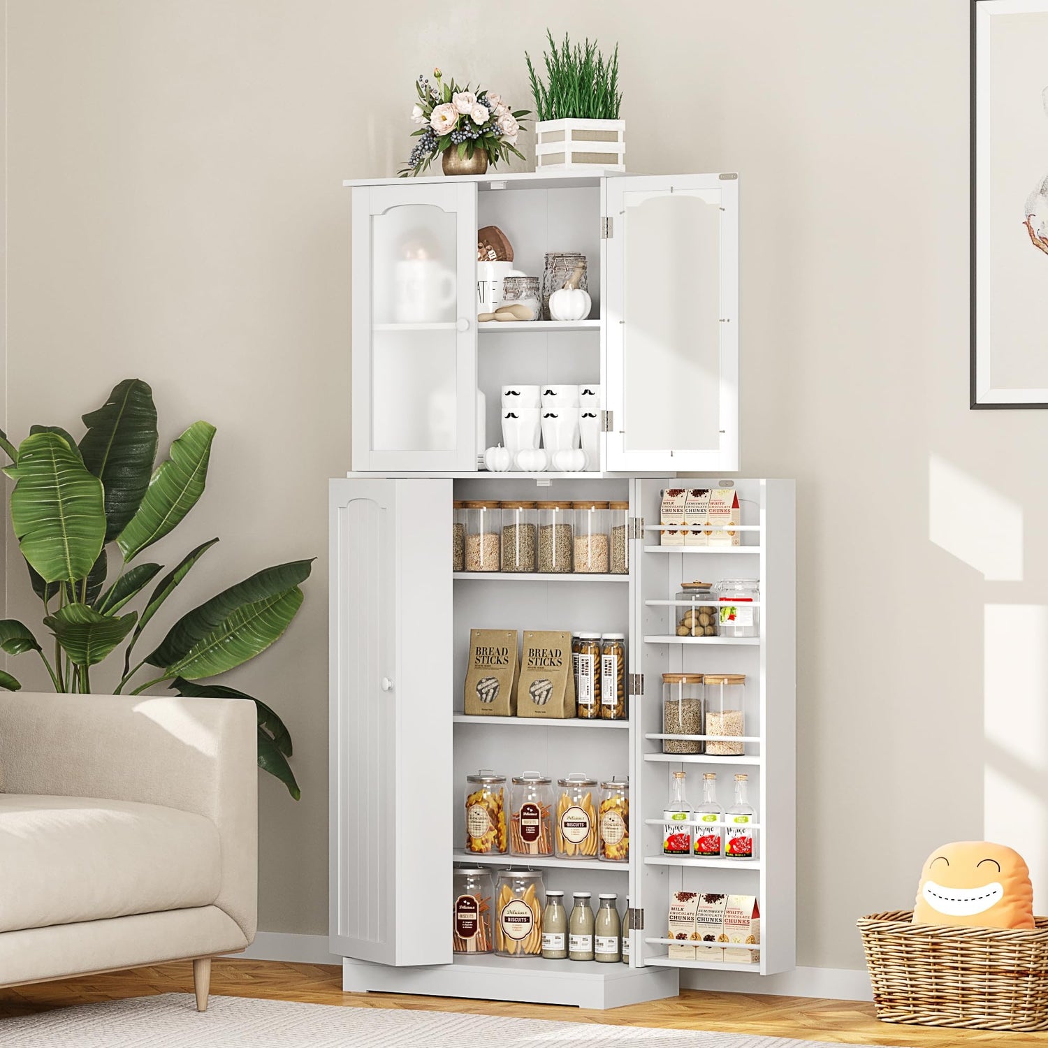 - 【Ample Storage Space】This tall kitchen pantry will provide you with extra storage space. 2-tier shelves with glass door panels on the upper level allow you to store your most delicate items, keeping them dust-free but still clearly visible. The base is a double-door cabinet with 10 storage compartments and 4 shelves behind the side door, providing invisible space and a better place to organize your essentials.