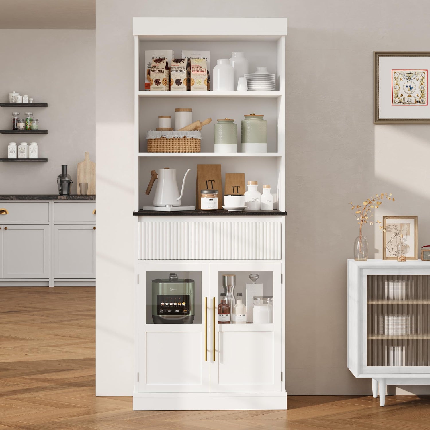 IDEALHOUSE 70" Tall Kitchen Pantry Cabinet, Storage Cabinets with Drawer & 2 Glass Doors and 3 Shelves, Floor Cabinet for Kitchen, Office, Living Room, Dining Room, Bathroom, White