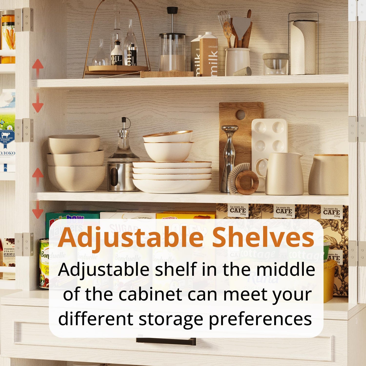 - Door Storage Racks: The cabinet comes with 6 door racks, which can be designed with customized space for small kitchen items such as spice jars, canned goods, and olives to maximize the use of cabinet space.