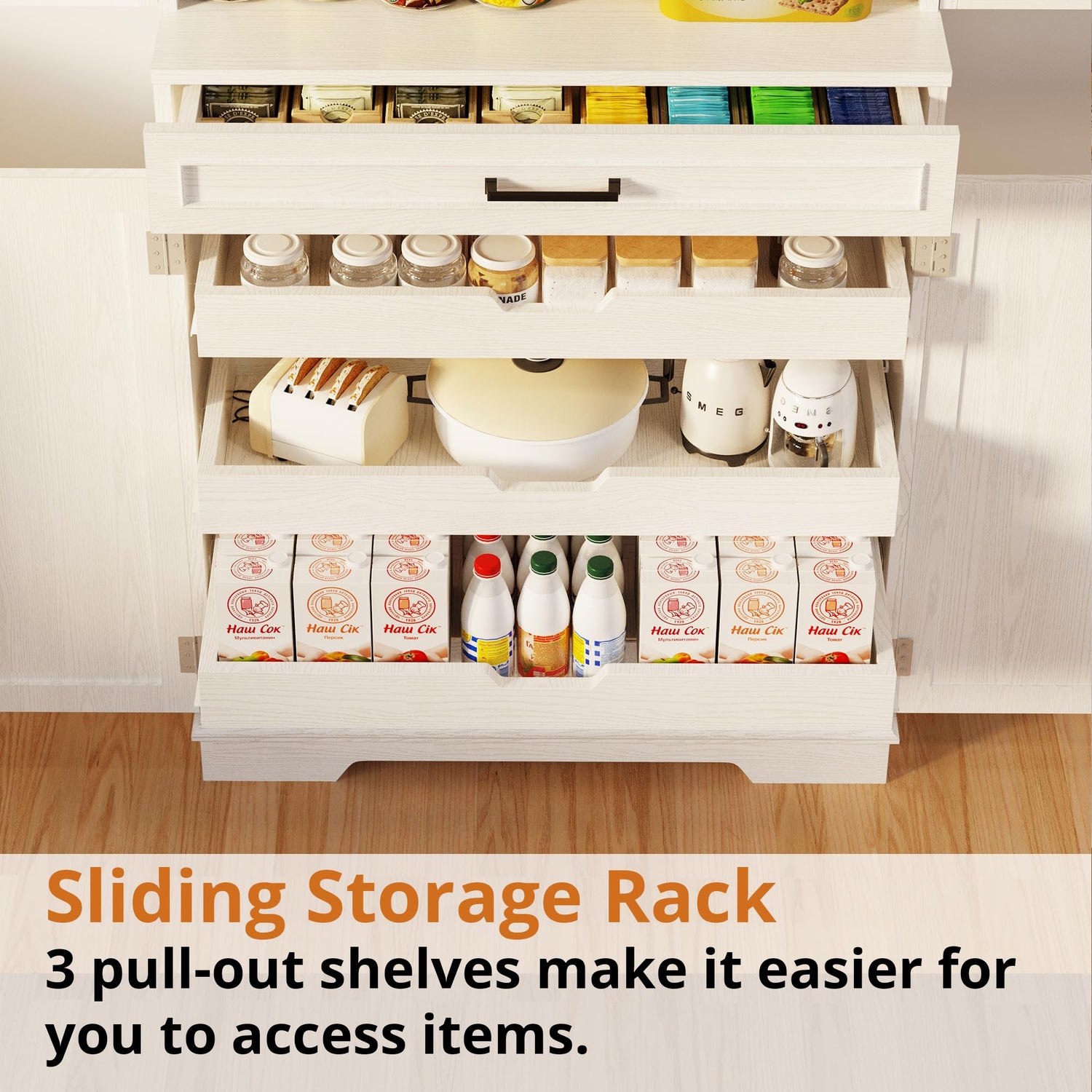- Sliding Storage Racks: The cabinet comes with 3 sliding racks, which can be used flexibly for various items. Large-capacity kitchen cabinets can keep your kitchen clean and tidy. No matter where you put it, you can organize it.