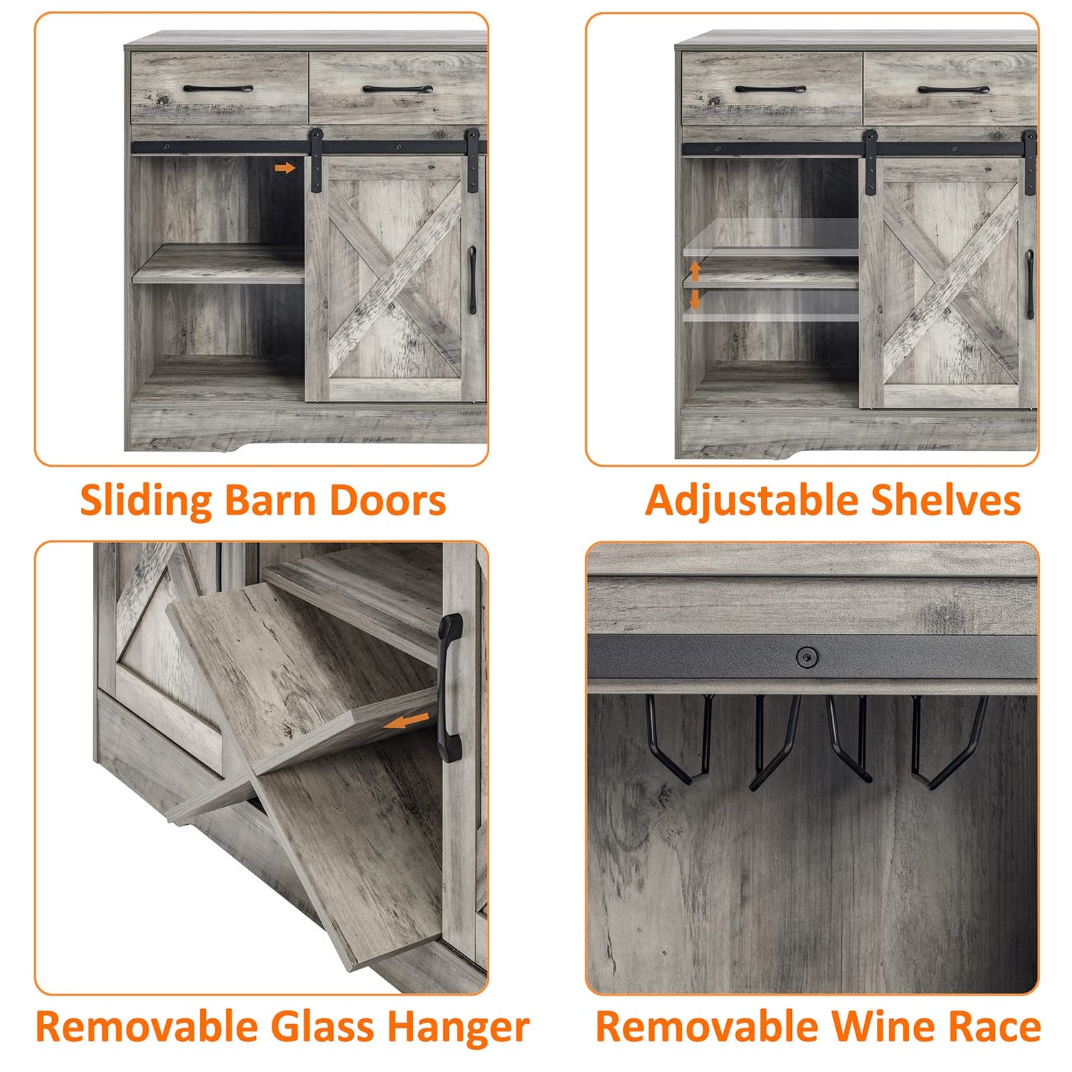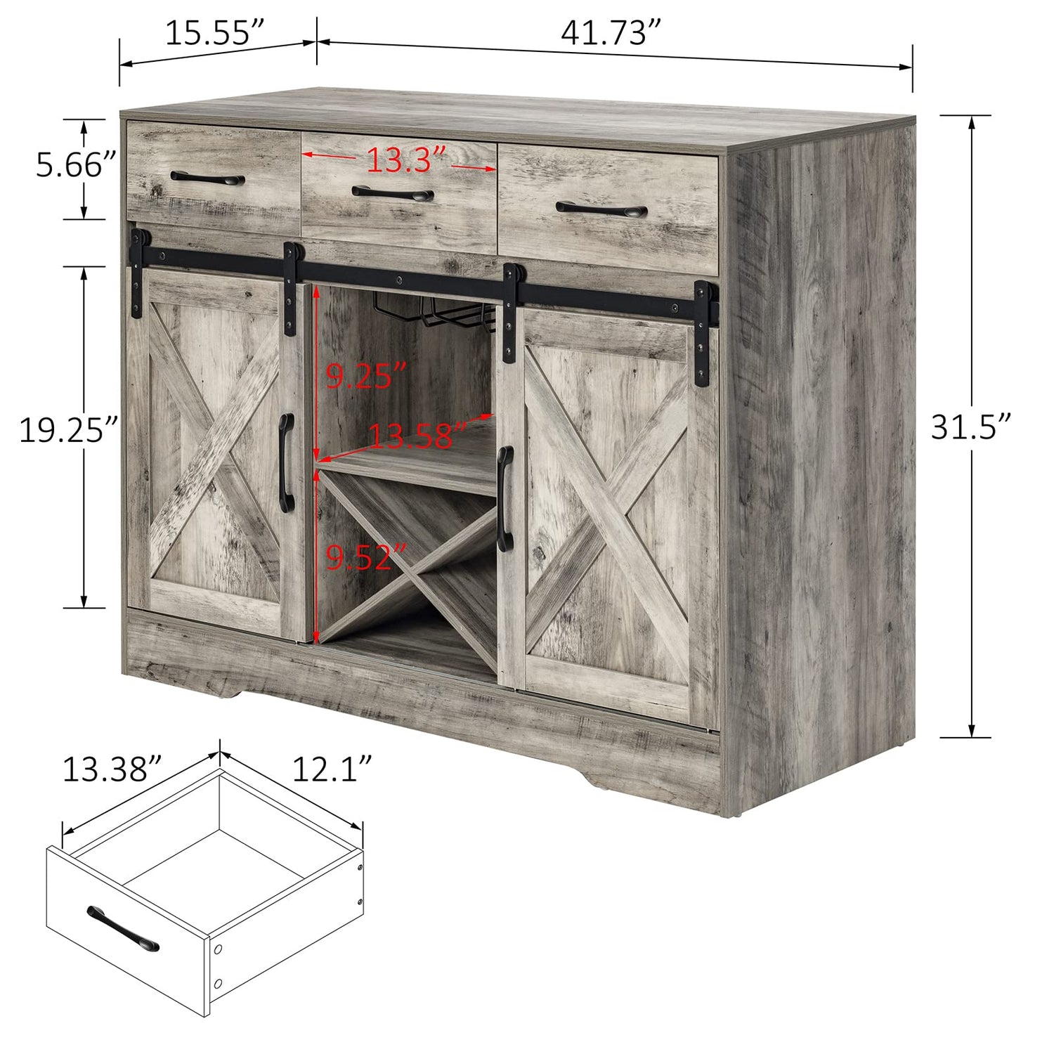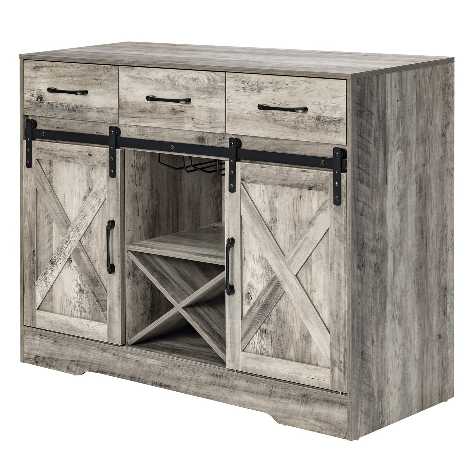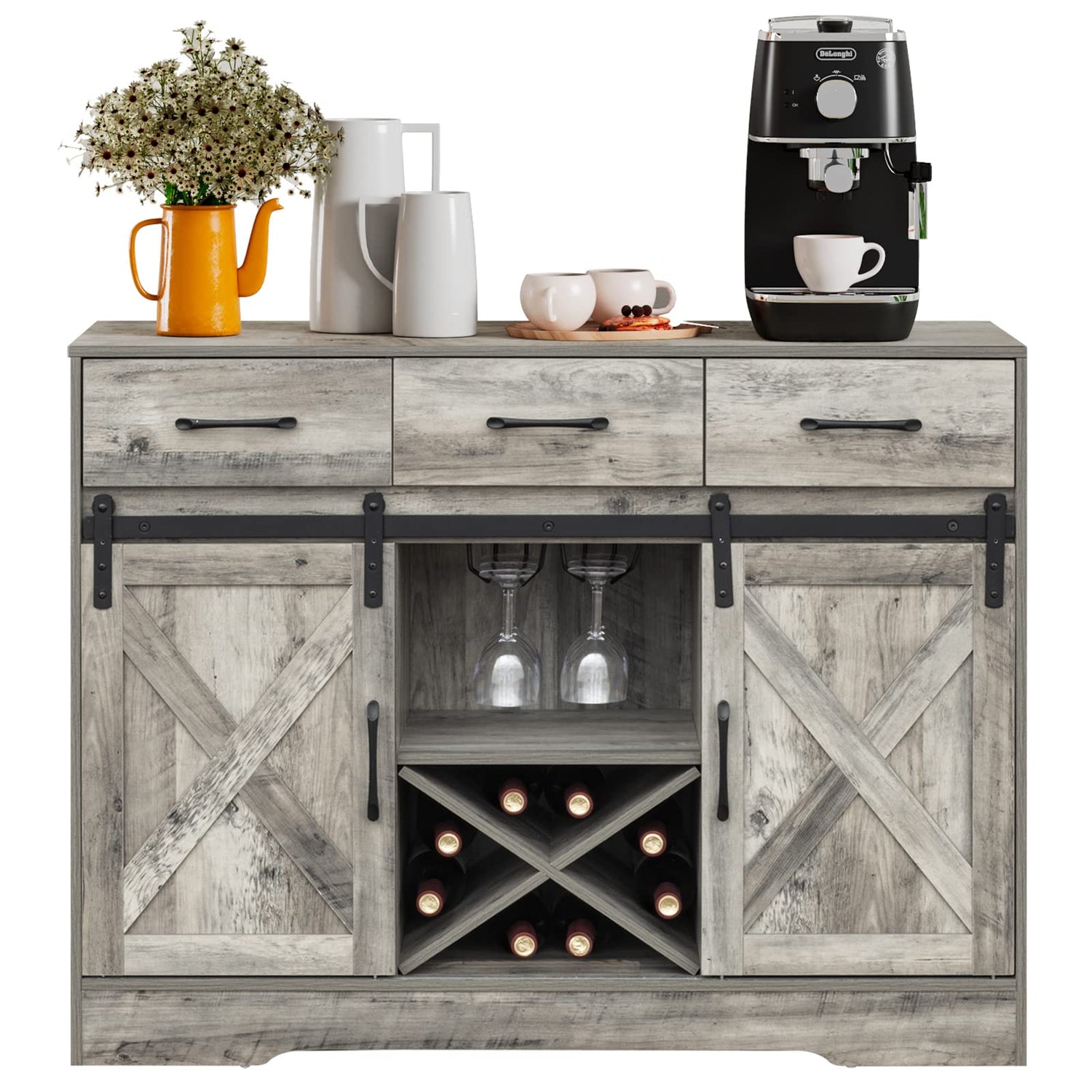Chic Grey Farmhouse Wine Cabinet and Coffee Bar with Sliding Barn Doors and Ample Storage
