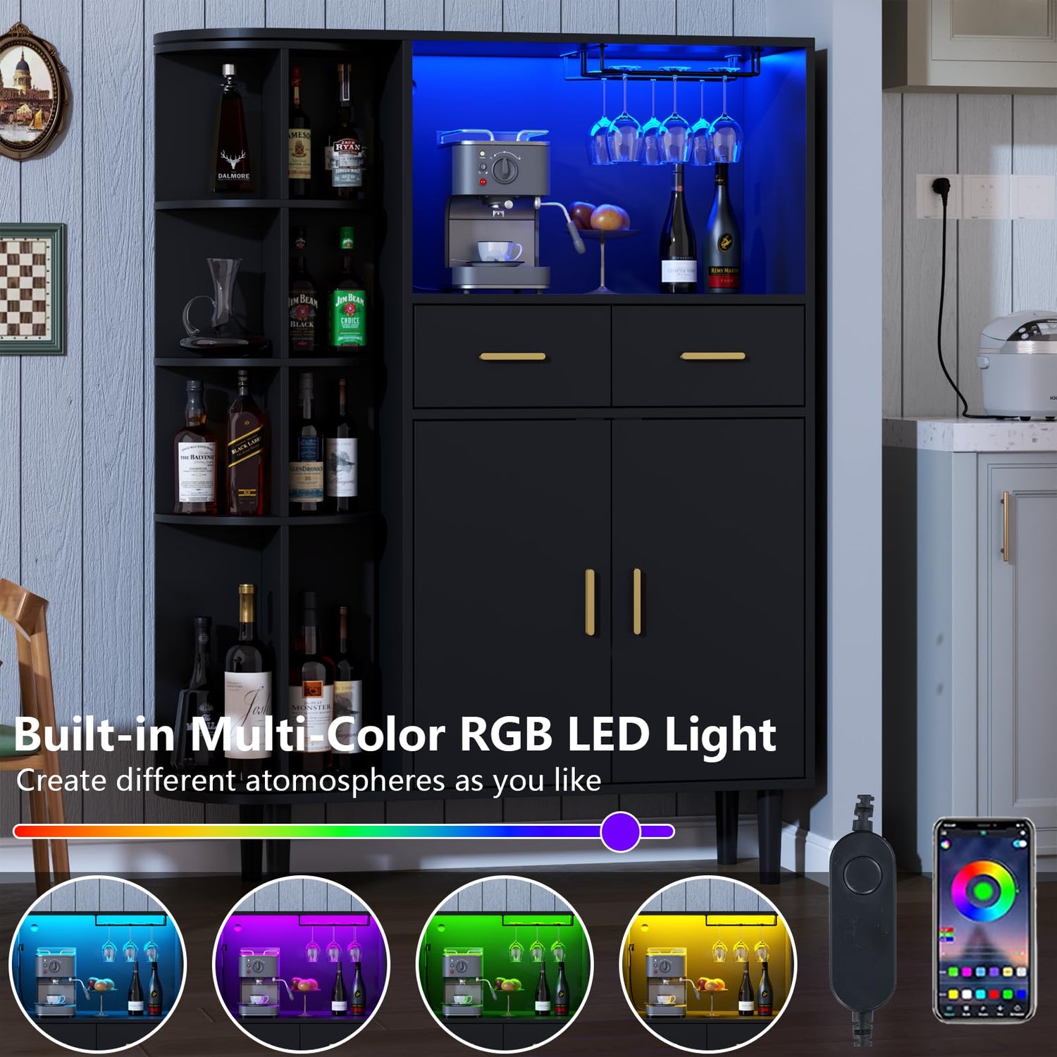 Kitchen Pantry Storage Cabinet with Charging Station and LED Lights, Freestanding Buffet Cabinet with Wine Glass Holder,Kitchen Hutch Cabinet with Rotation 4-Tier Storage Rack for Kitchen(Black)