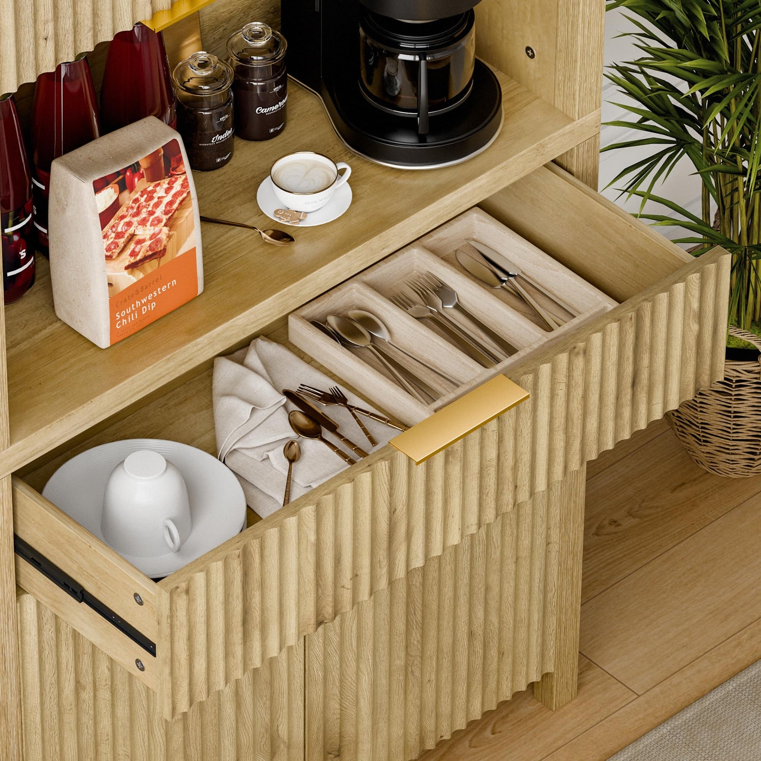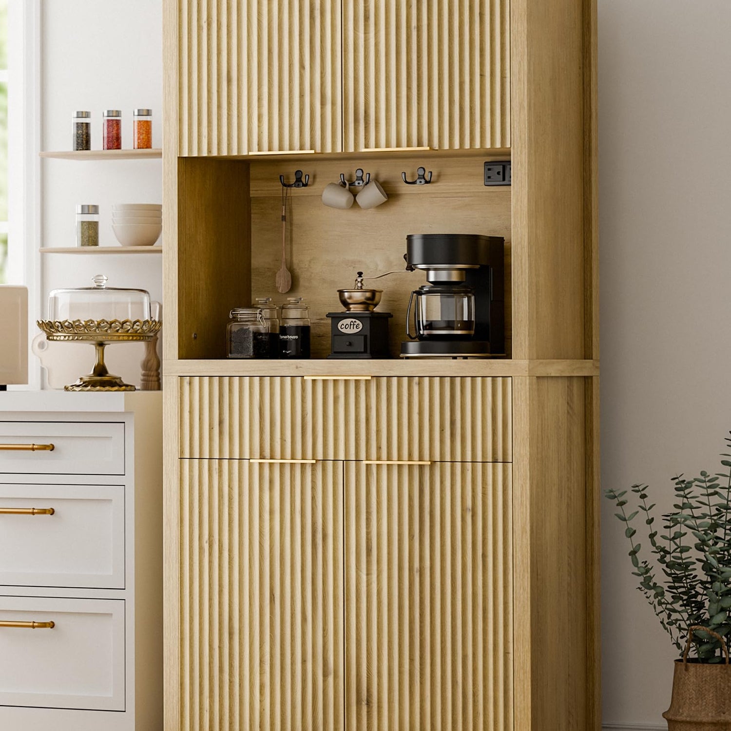 Lulive 71" Fluted Pantry Cabinet with Charging Station & Adjustable Shelves, Spacious Kitchen Storage Cabinet with Open Countertop & Drawer for Dining Room, Living Room, Natrual