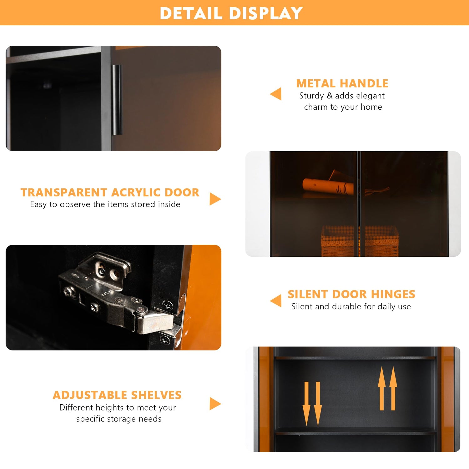 - 📚【Durable Materials】- The pantry storage cabinet with transparent acrylic doors is crafted from engineered MDF board, which is durable and sturdy to hold all of your items. The spray painted surface is sleek and easy to clean.
