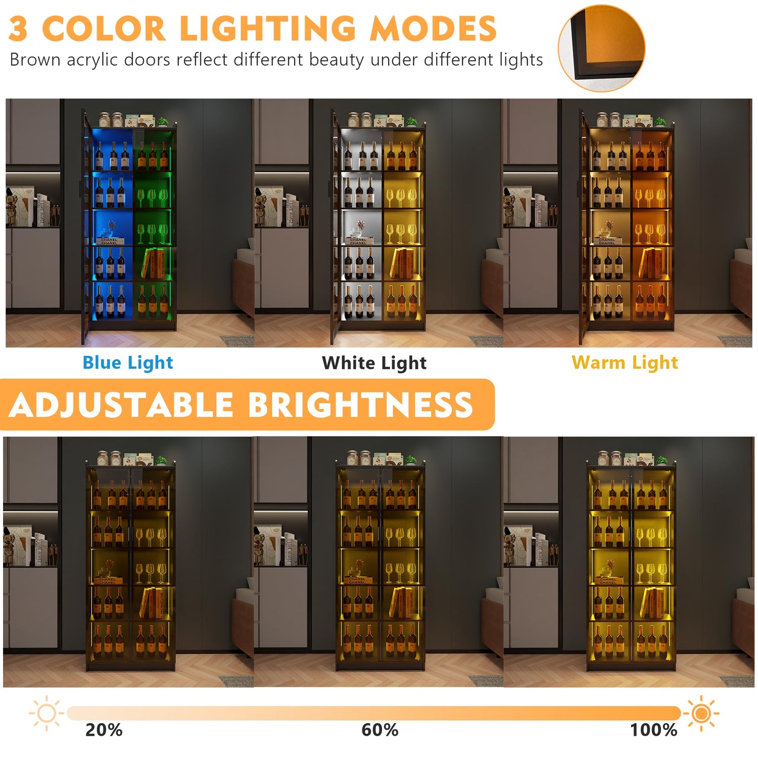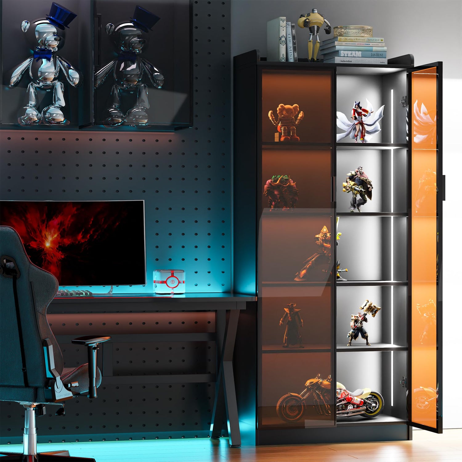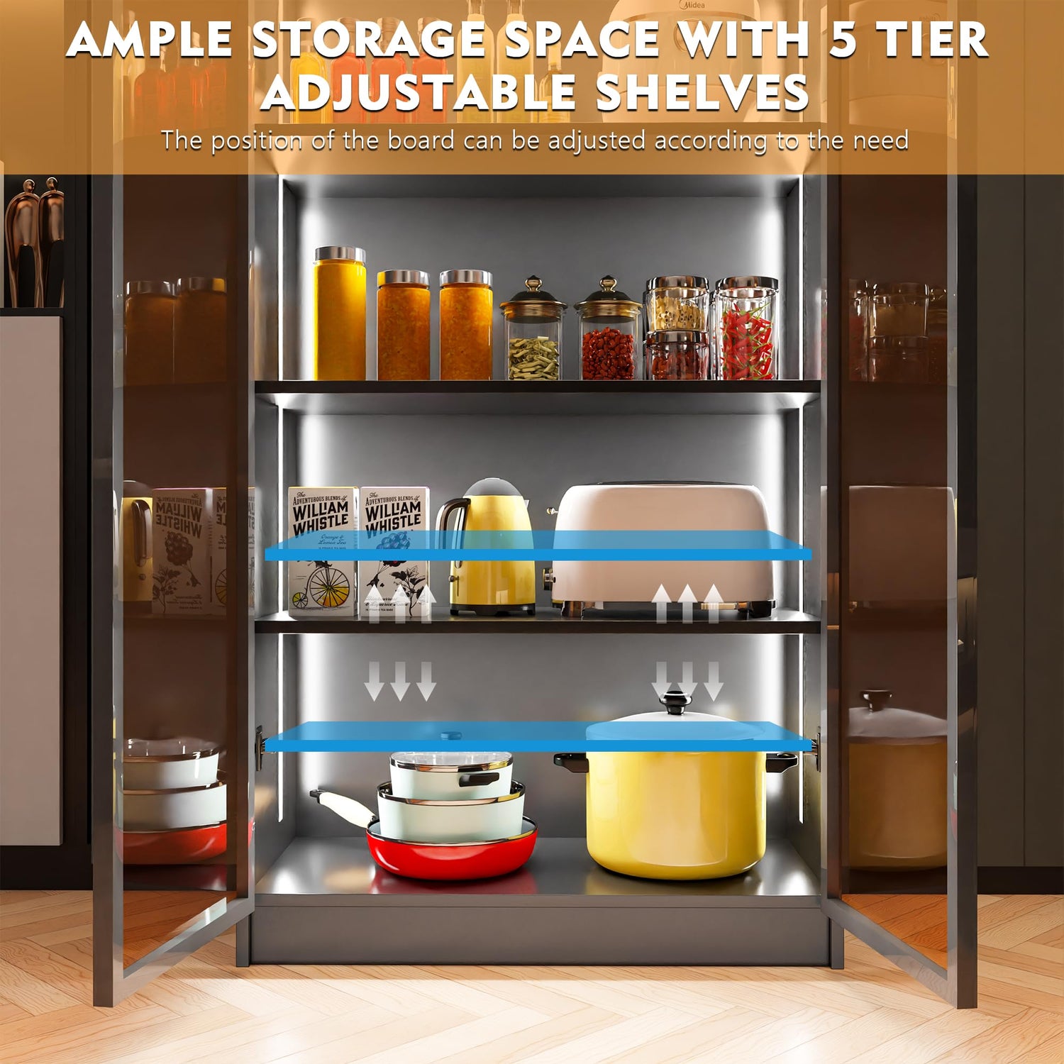 Lvifur Tall Storage Cabinet up to 70", LED Kitchen Pantry Cabinet with Human Body Induction, 5 Tier Bookcase Display Cabinet with Adjustable Shelves for Living Room Office (Black)