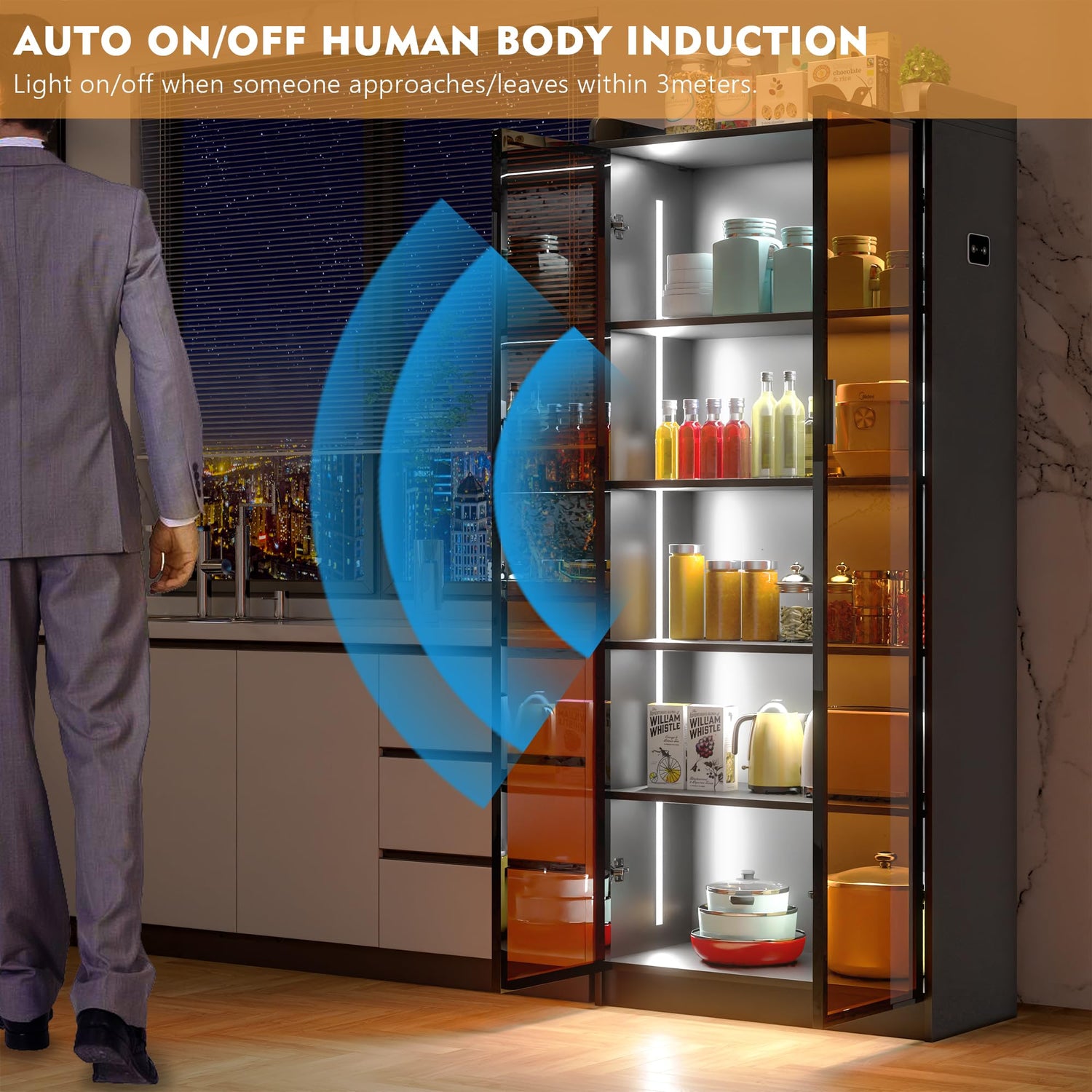 - ✨【3 Dimmable Lights & Body Sensor】 - The kitchen storage cabinet has 3 color LED lights (Warm, Blue, White) & adjustable brightness. With human body induction, the lights will auto turn on/off when someone approaches/leaves.