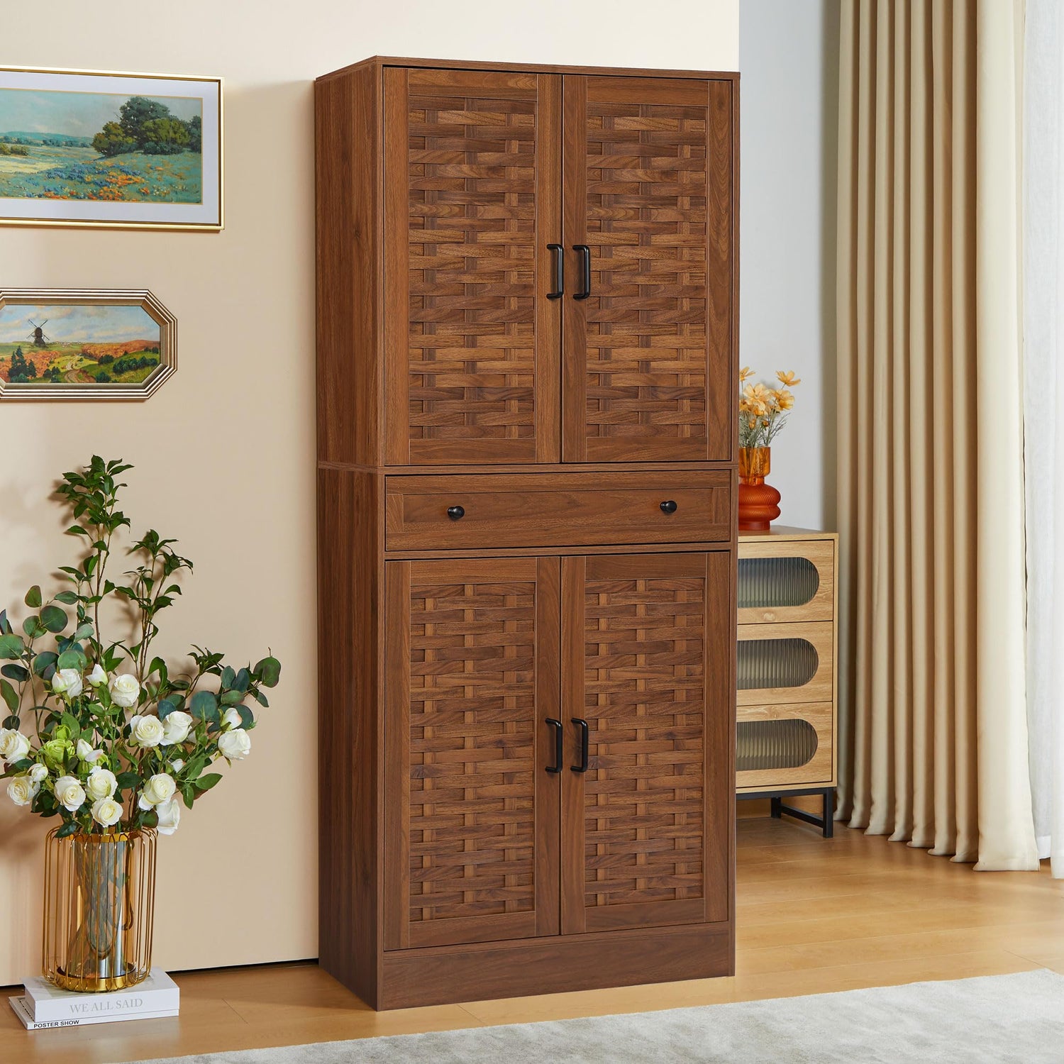 NVETHM Storage Cabinet, Kitchen Pantry, Freestanding Cabinet with Adjustable Shelve and drawer, Tall Cabinet for Living Room, Bedroom, Dinging Room, Office Room, Garage (Walnut)