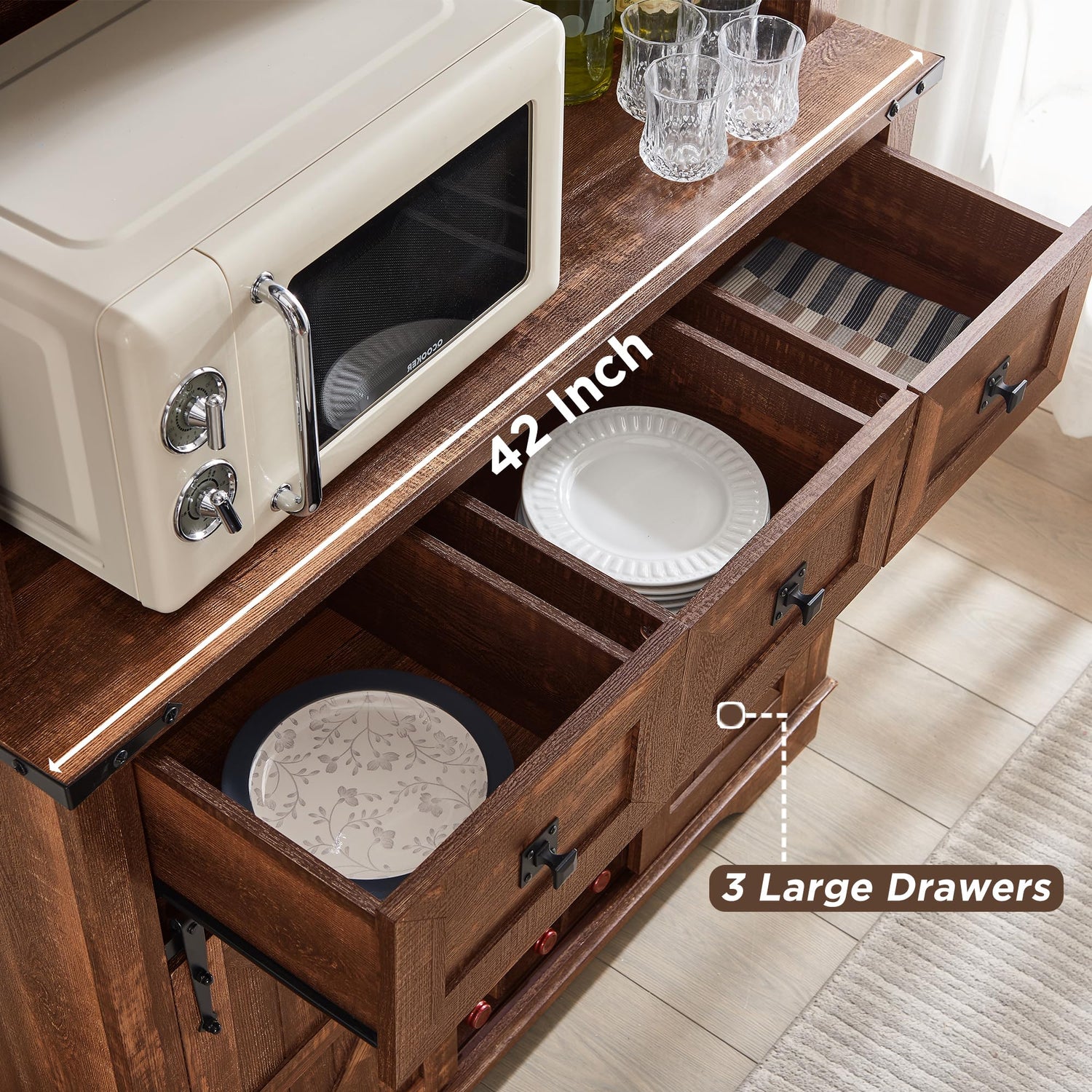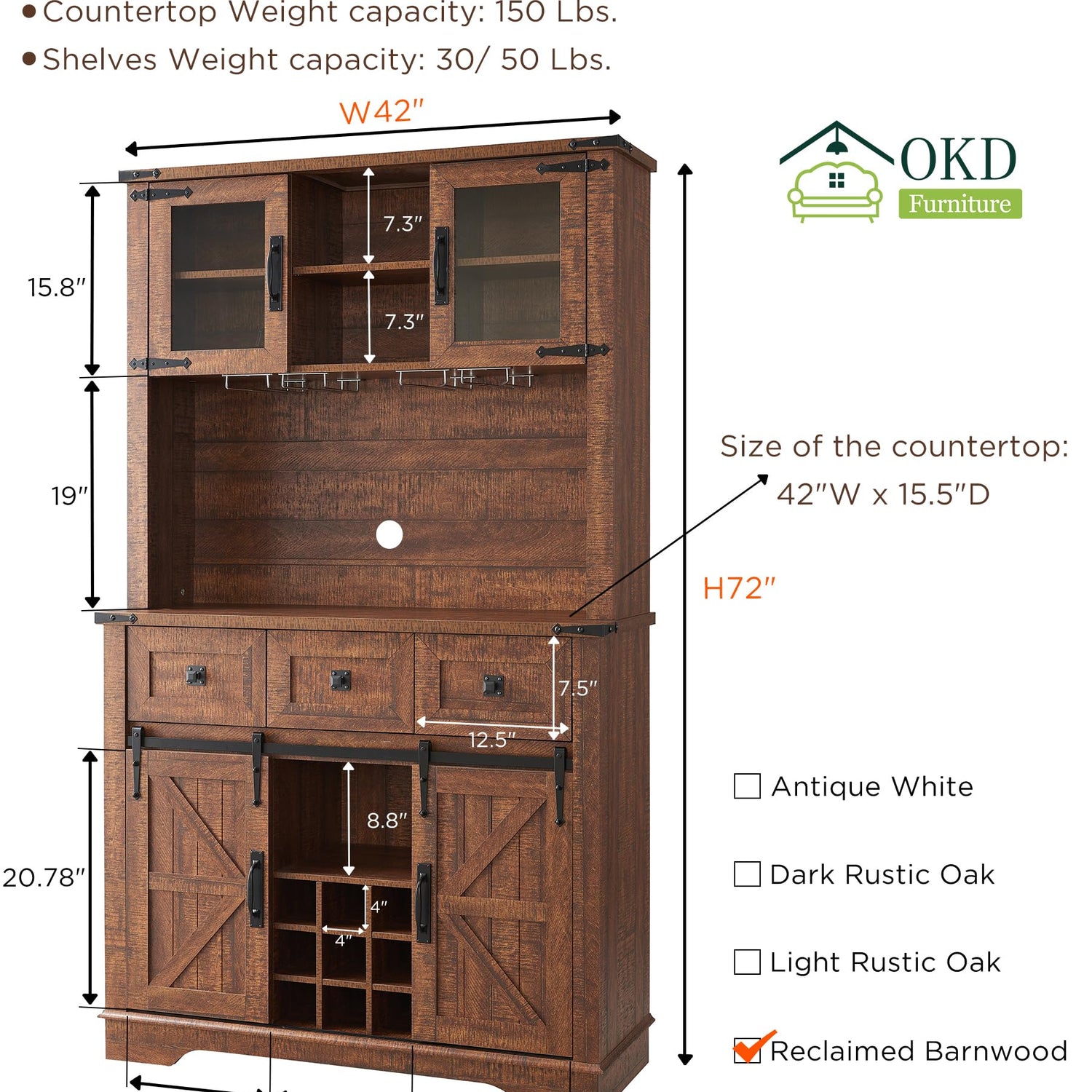 OKD 72" Farmhosue Bar Cabinet with Sliding Barn Door, Large Kitchen Buffet with Hutch w/Wine & Glasses Rack, 3 Drawers, 12 Storage Shelves, Rustic Coffee Bar Sideboard Table, Reclaimed Barnwood