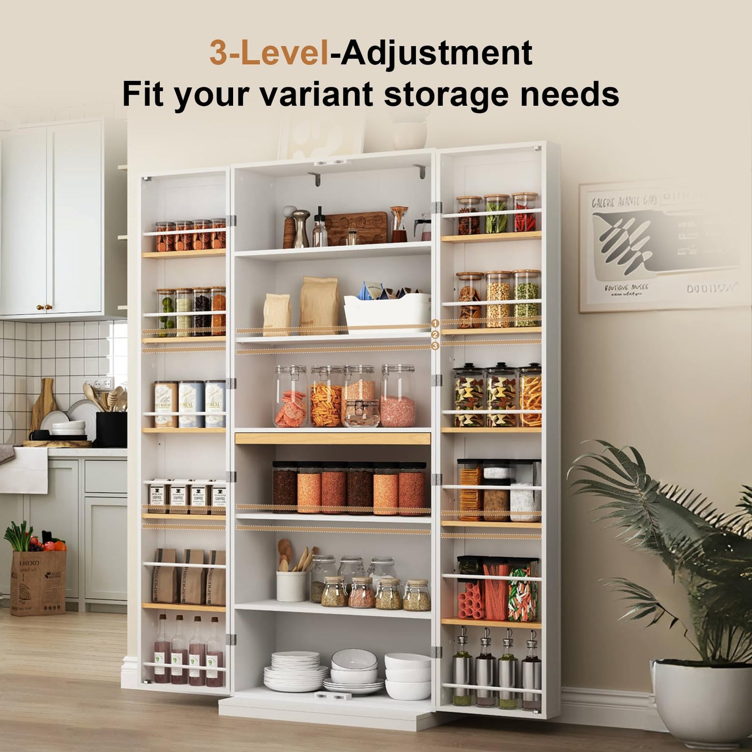 • 【Ample and Well-Designed Storage】This tall pantry storage cabinet boasts an immense storage capacity. It features 1 pull-out shelves, 6 central adjustable shelves and 12 door shleves,gives you plenty of room for dishes, cookbooks, pots and pans, spice jars. Meanwhile, the side racks are designed with bars to prevent items from falling over